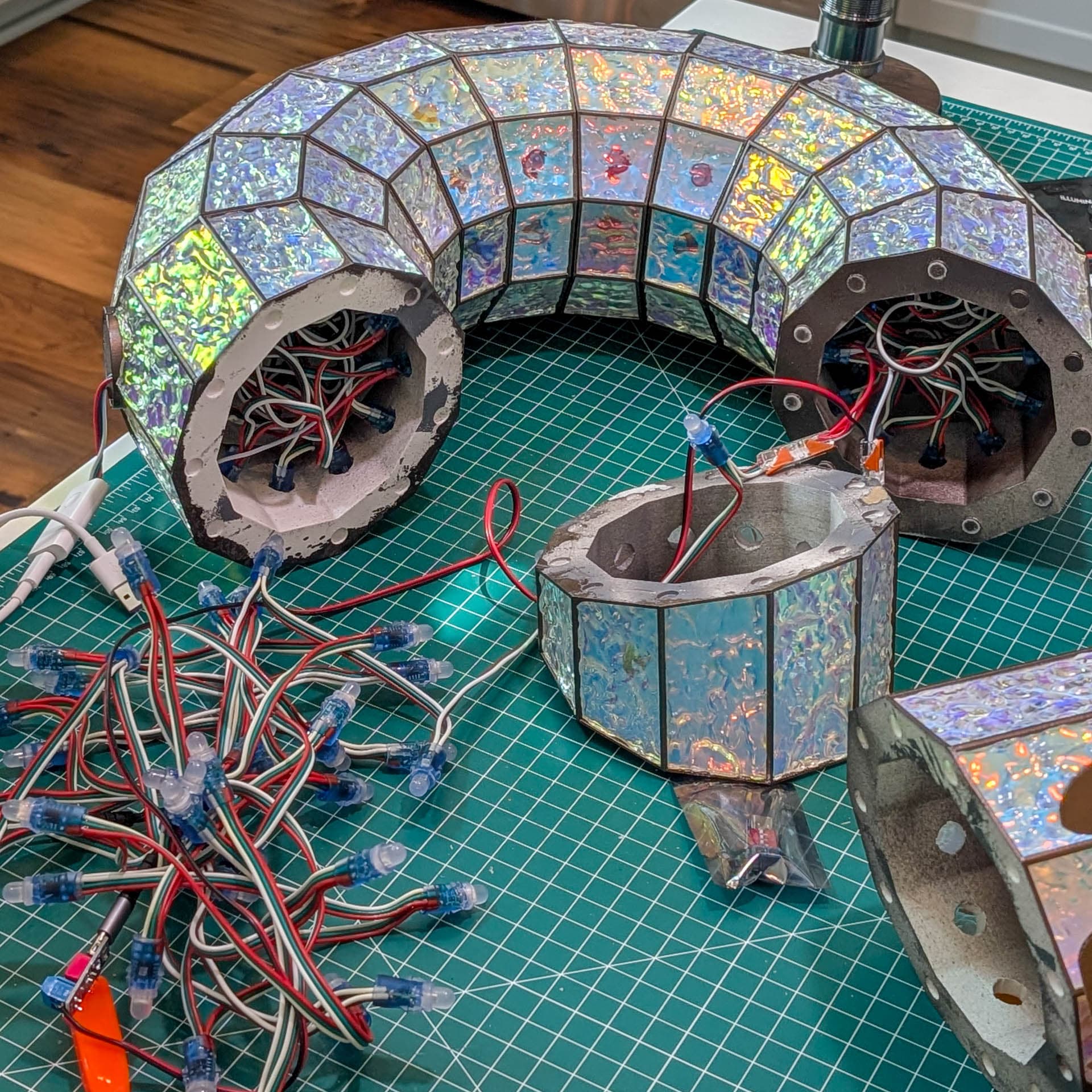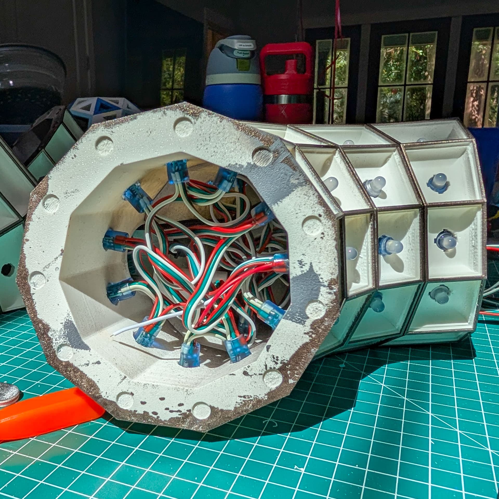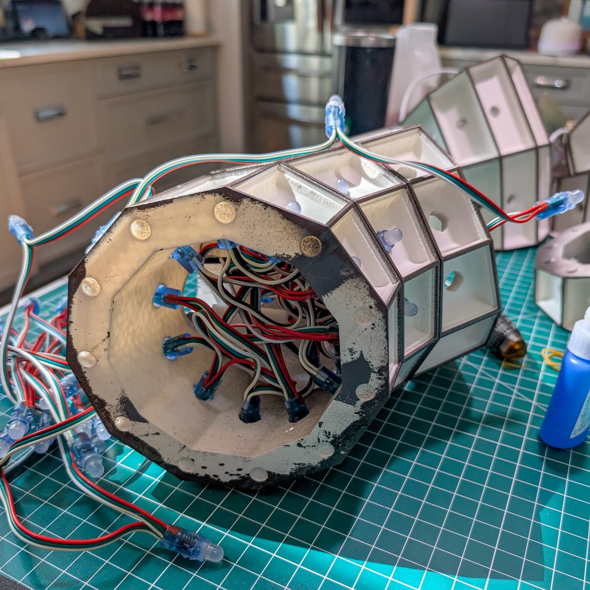 The wires are installed serially in a sequential pattern around each plastic piece. This also ensures that the wled light sequences work correctly, especially using segments. To remove one of those pieces and replace it with something else would require you to cut the wires. Also, the internal diameter of each piece is big enough for the wires, but you wouldn’t be able to get your hand in there there to run a separate wire up to the point where it needed to be spliced. We had to add the pixel lights to each segment as we went knowing that we wouldn’t be able to get back to that section after it was glued together. Something to try to solve for a future design. Maybe to have shorter wire segments and removable segments.
