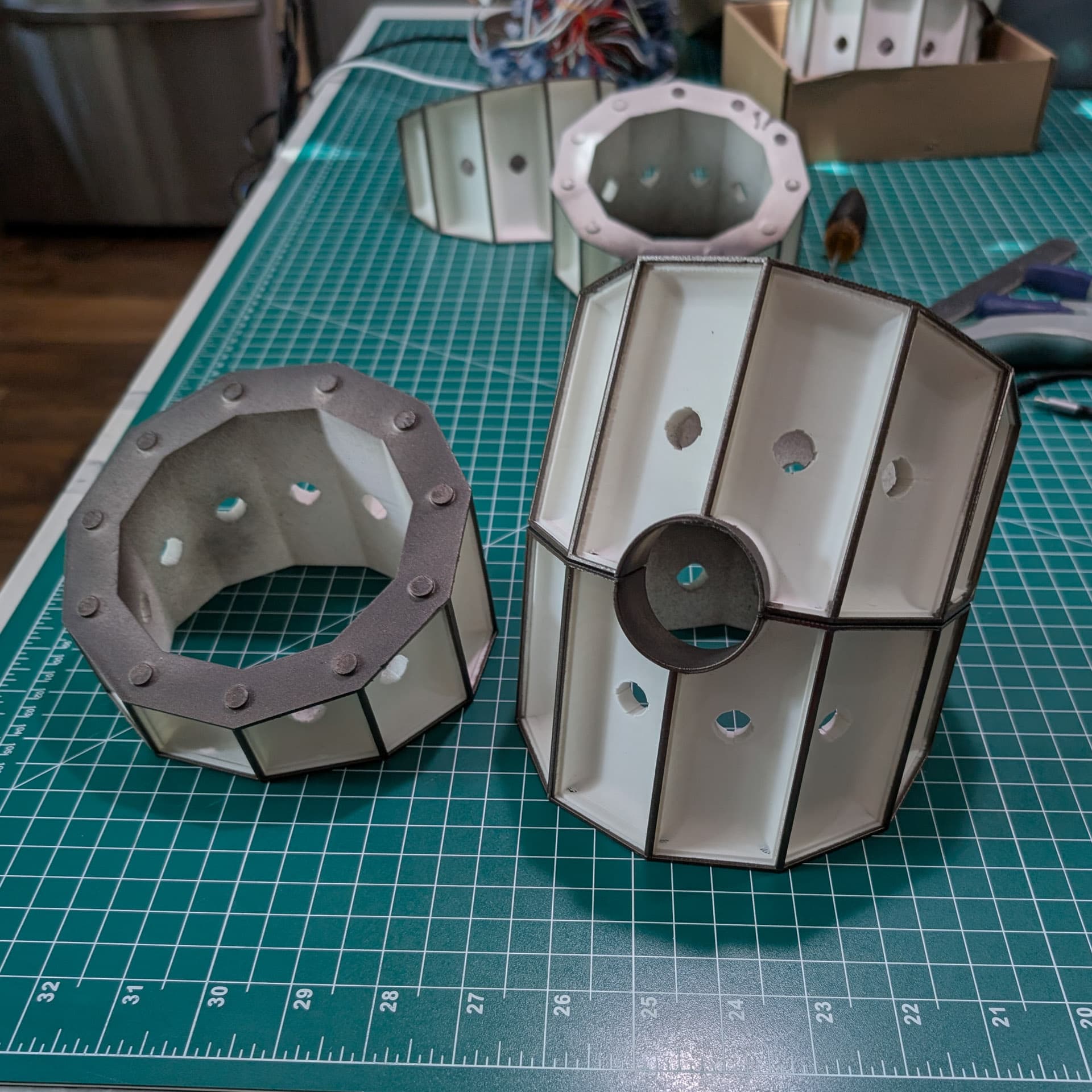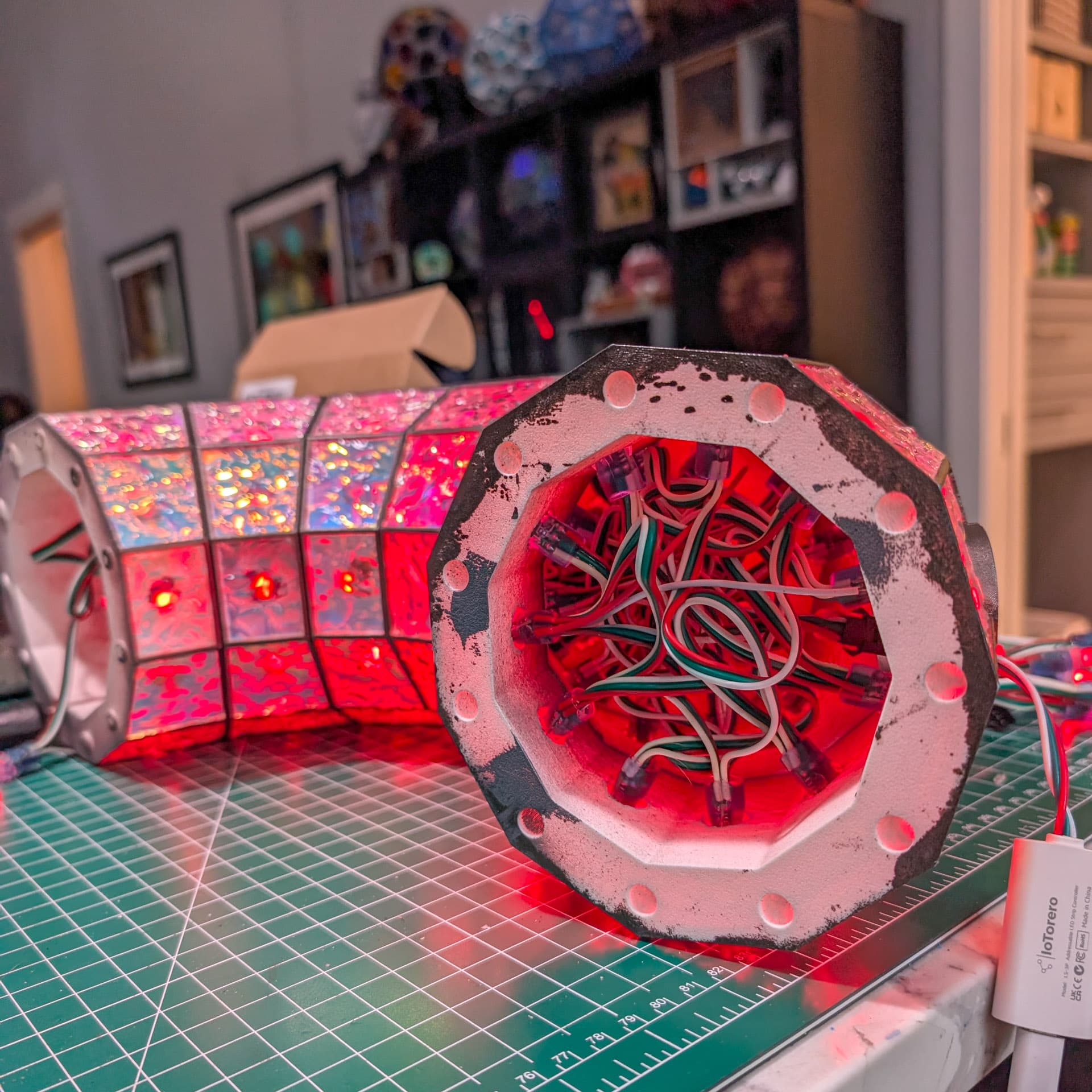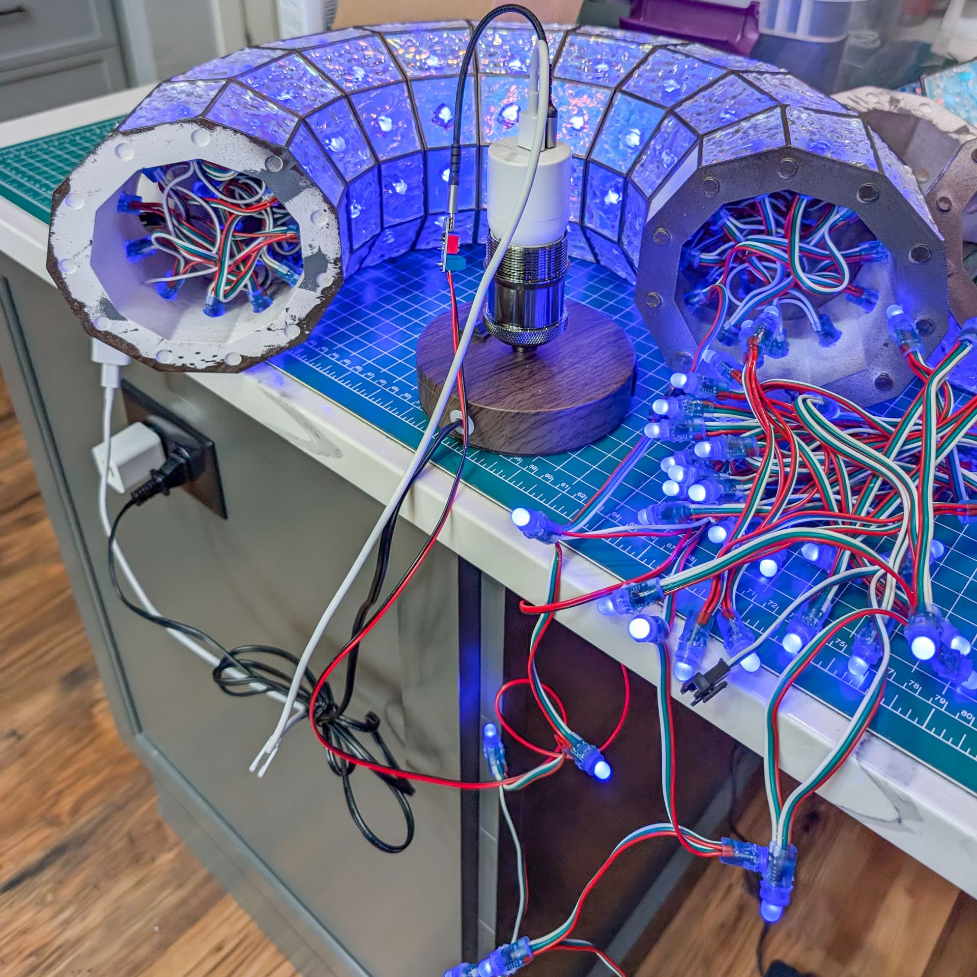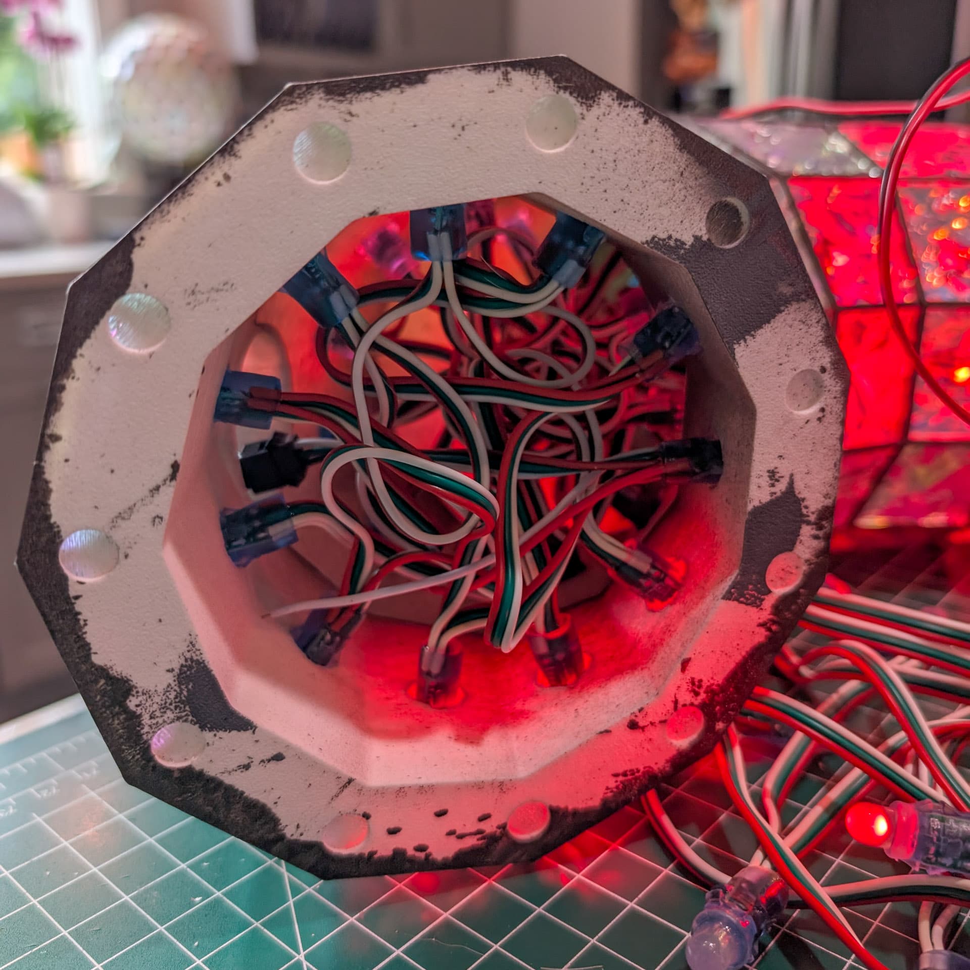 The wires are installed serially in a sequential pattern around each plastic piece. This also ensures that the wled light sequences work correctly, especially using segments. To remove one of those pieces and replace it with something else would require you to cut the wires. Also, the internal diameter of each piece is big enough for the wires, but you wouldn’t be able to get your hand in there there to run a separate wire up to the point where it needed to be spliced. We had to add the pixel lights to each segment as we went knowing that we wouldn’t be able to get back to that section after it was glued together. Something to try to solve for a future design. Maybe to have shorter wire segments and removable segments.