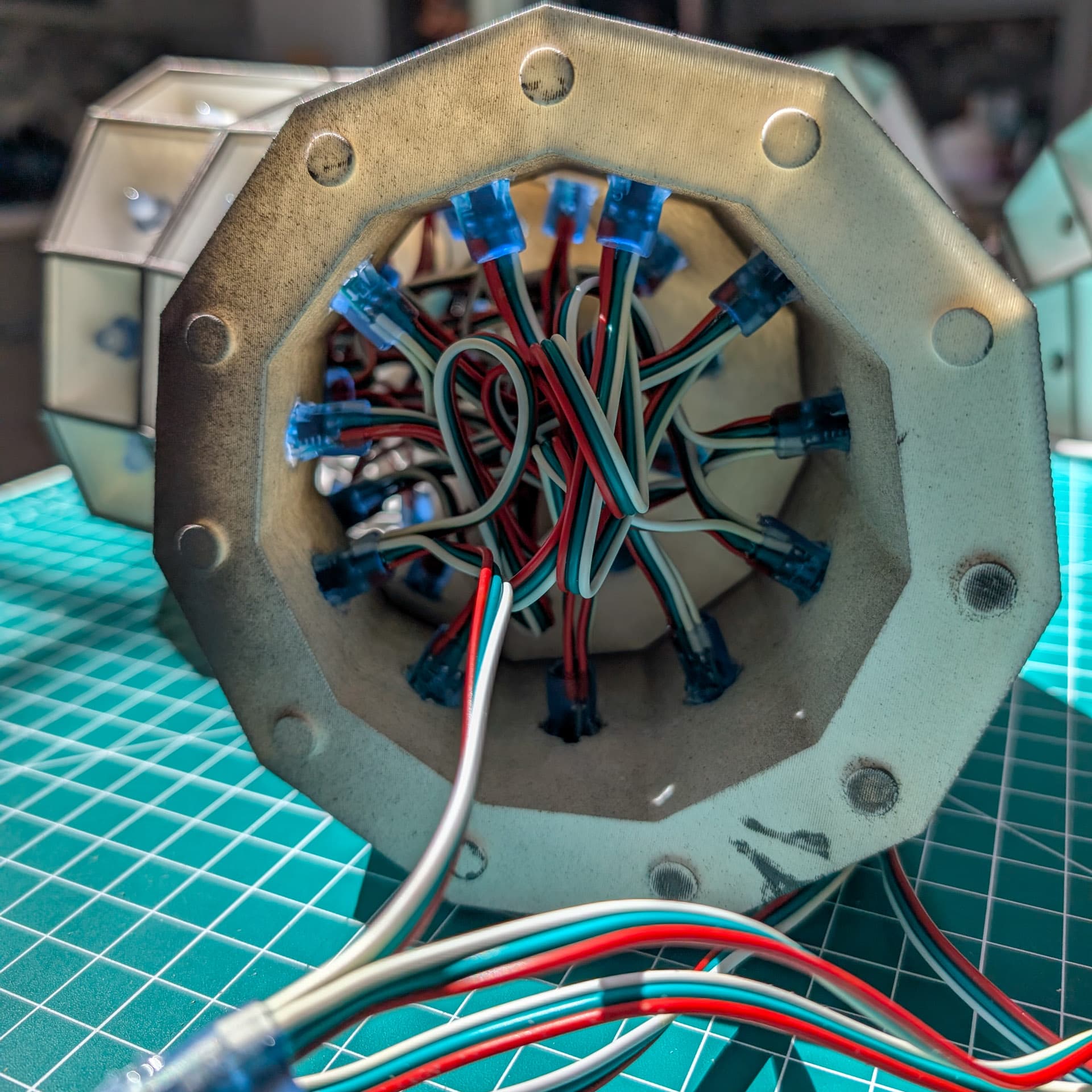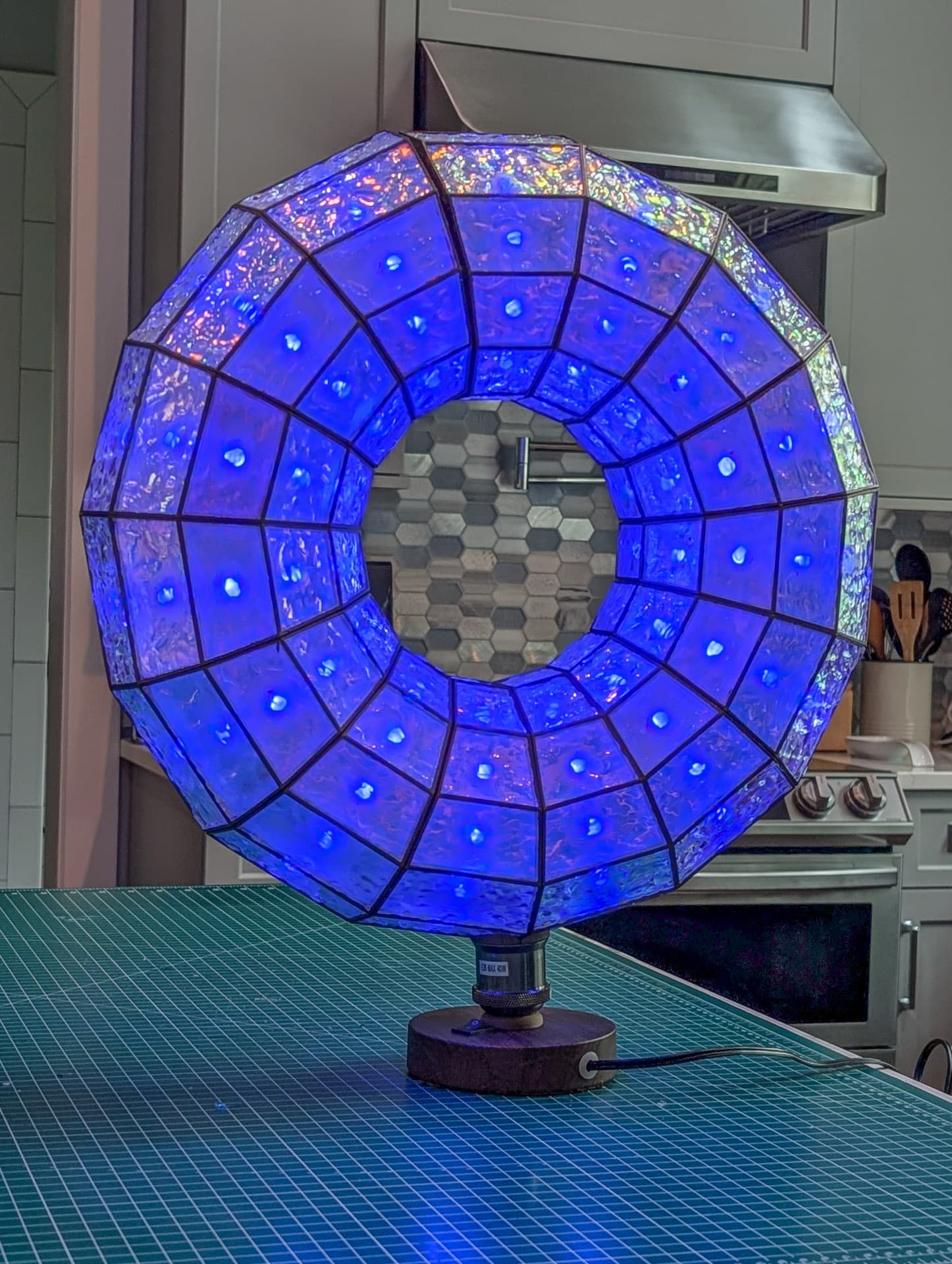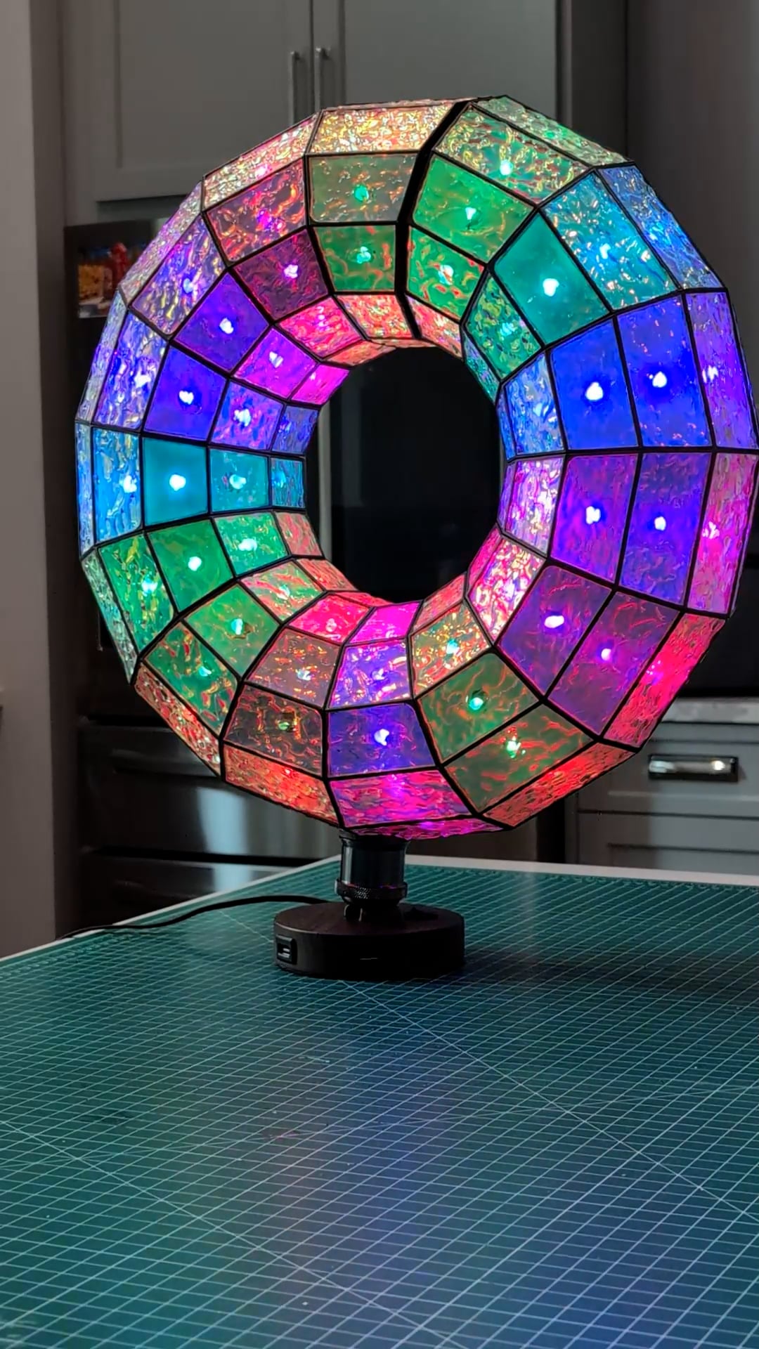 Yes, another custom WLED lamp. I had done a torus birdhouse earlier this year and thought the shape could make a pretty unique lamp. This one’s been in the works for a few months, but I require assistance assembling these projects. Unfortunately the sections didn’t come together perfectly, so I still need to fix a gap in the ring. I thought about posting this “mostly” finished shaped just to get your opinions on how to resolve it. Anyway, this torus is 15 sections, each with 11 faces totaling 165 individually addressable pixel LED lights. The torus sections were 3D printed using white PLA on a Bambu X1-C. I’m using a WLED Slim LED Strip Controller from Anthom with an additional 5V board for power injection. The faces are laser cut 1/8" Iridescent Molten Textured Acrylic from Houston acrylic.
