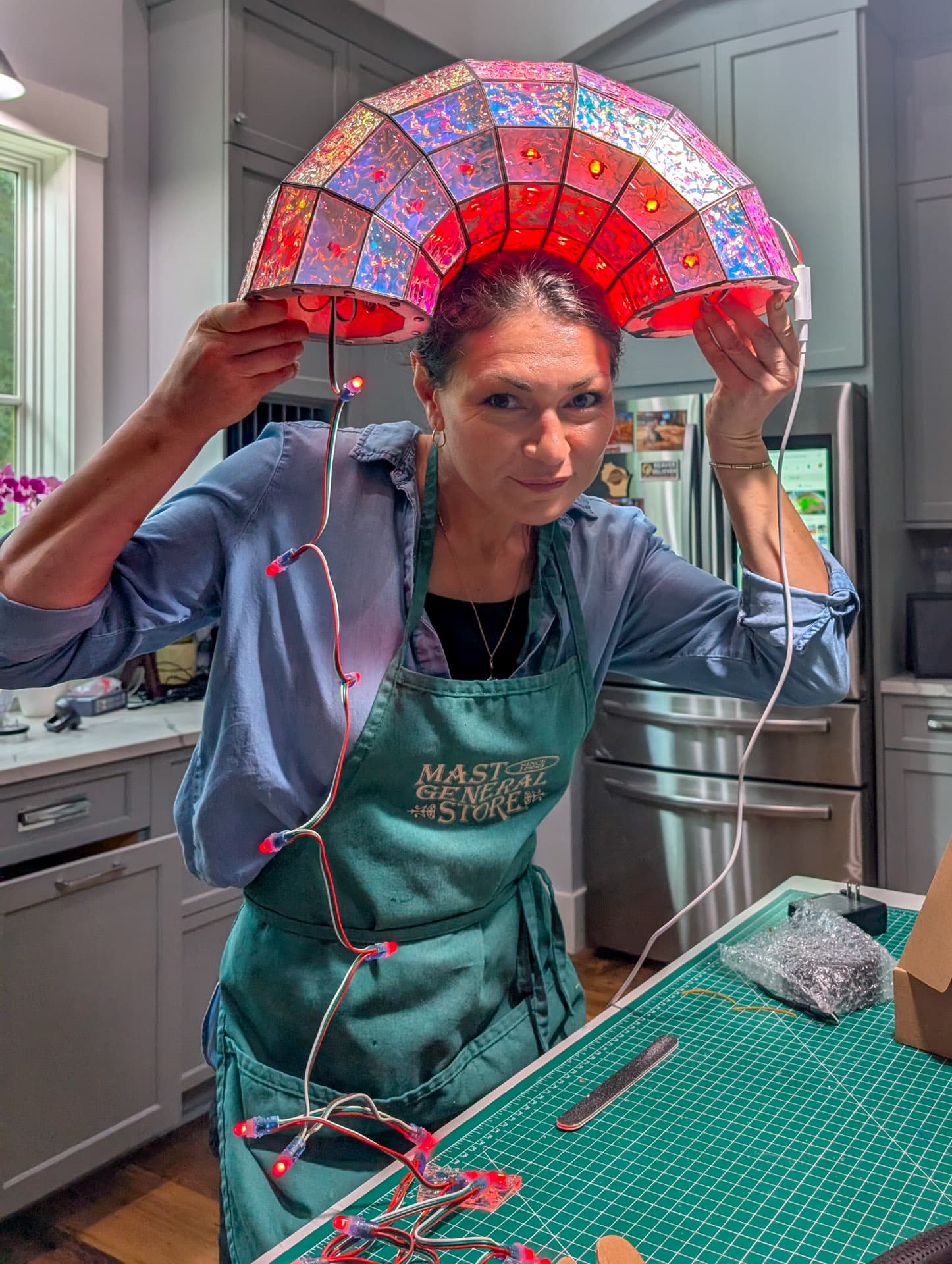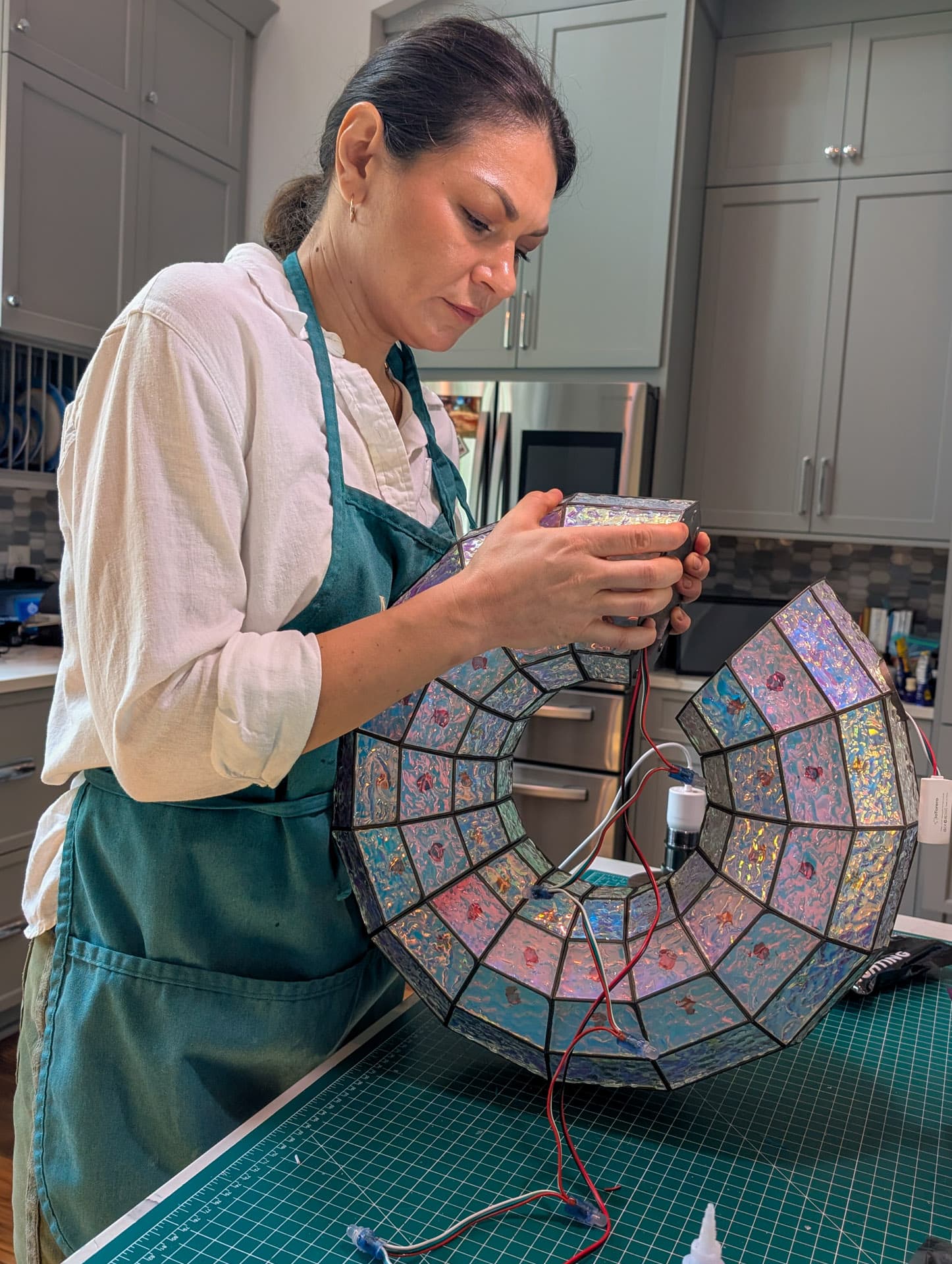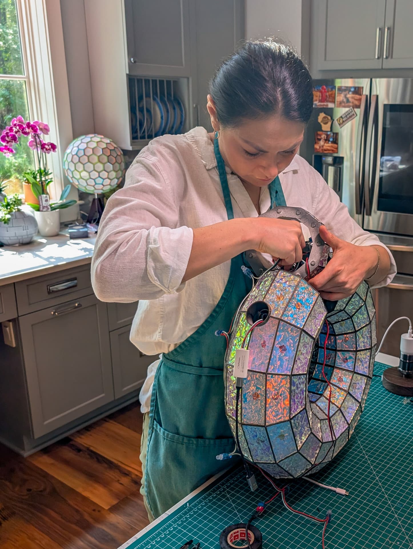 WOW! Love it. I would experiment on some of the material used to make the frame (PLA) and see if it becomes more malleable when left in the hot sun for a while. If so, I would try to slowly ratchet it together. I would be concerned about putting the lamp in even a low oven with all the wiring and covers. I have “slumped” acrylic, but I certainly am not an expert, just my 2 cents.