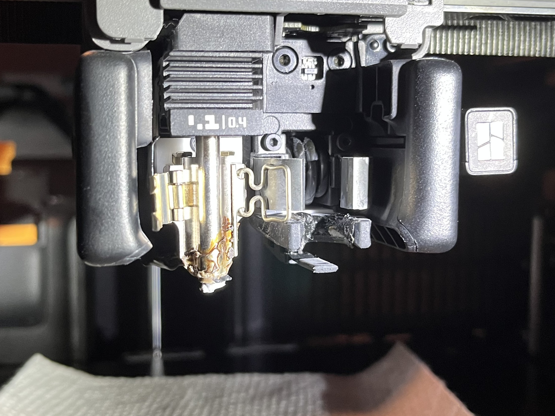 * Once the main blob is gone, use a brass wire brush to scrub the nozzle and heater block while it is still hot.