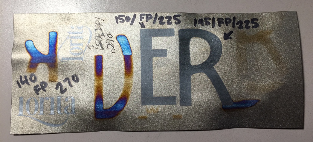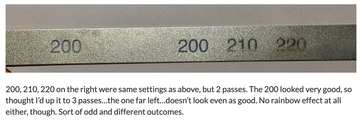 Cool experiments! In that test where you got the nice gold, blue, and purple… the increase to 270 LPI would deposit more heat. Closing in on the sweet spot there looks like. There is also that sweet purple outline to the blue, great effect!