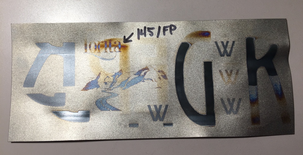 Sort of made me laugh…that ‘great effect’ is actually the back side of the piece…it’s the reverse side of those large black letters in the second photo on the right side…which the laser didn’t even completely finish. I would love to get those colors, but it’s all a crap shoot. So far, the image of the mountains is the only thing that comes out with color. I found that the image and the smaller texts do just great at 270 LPI, but the big letters have to be at 225.