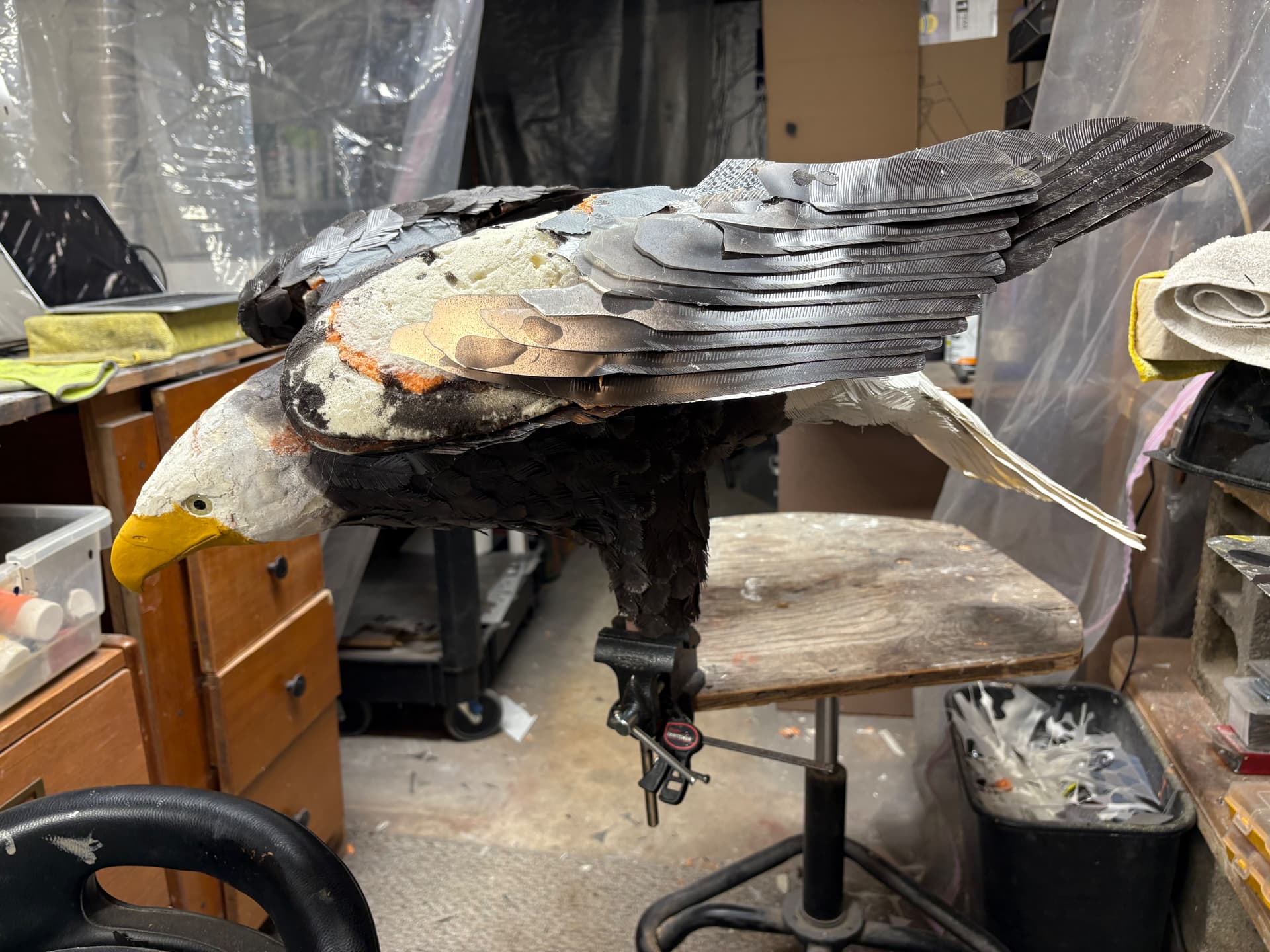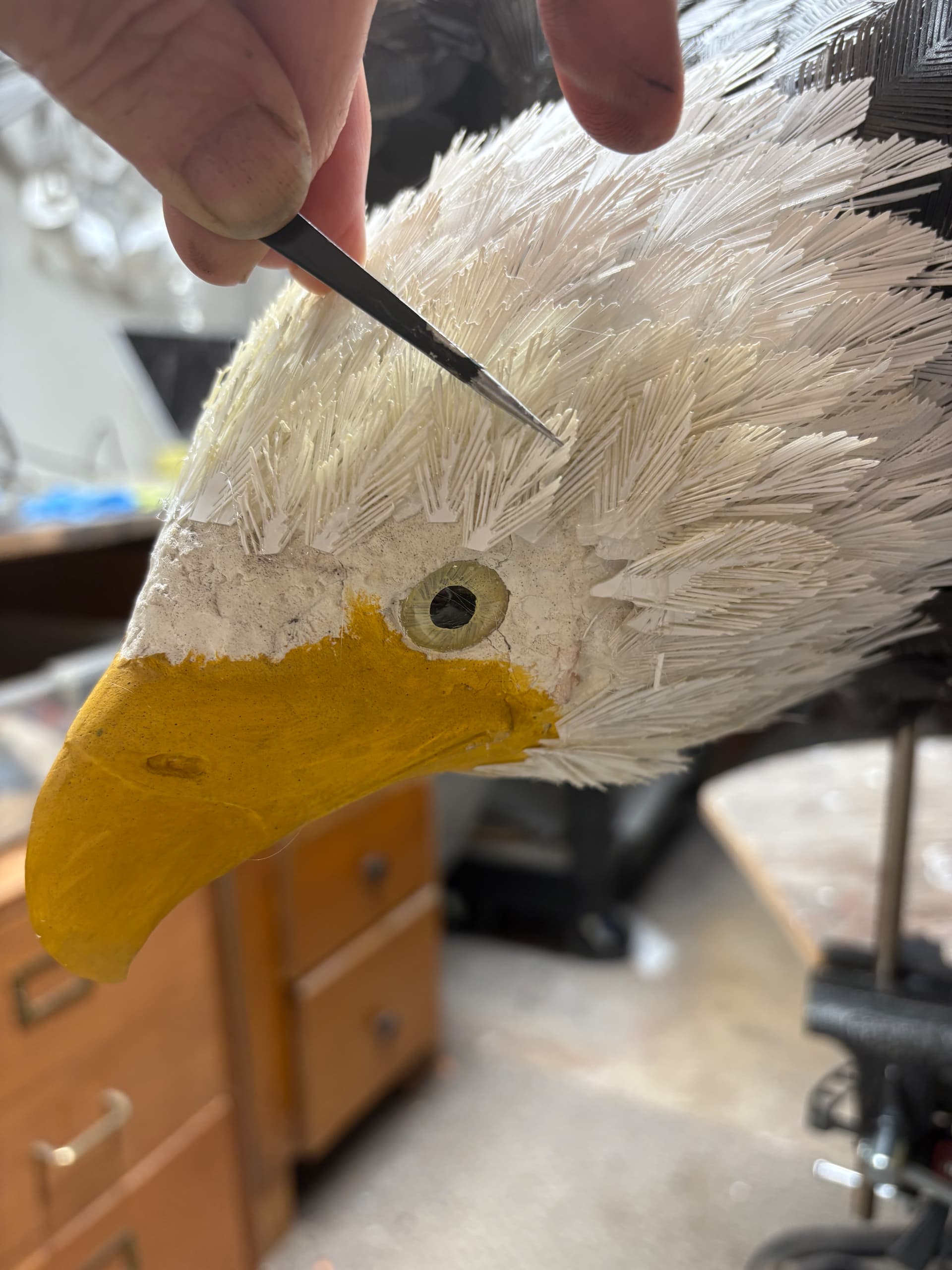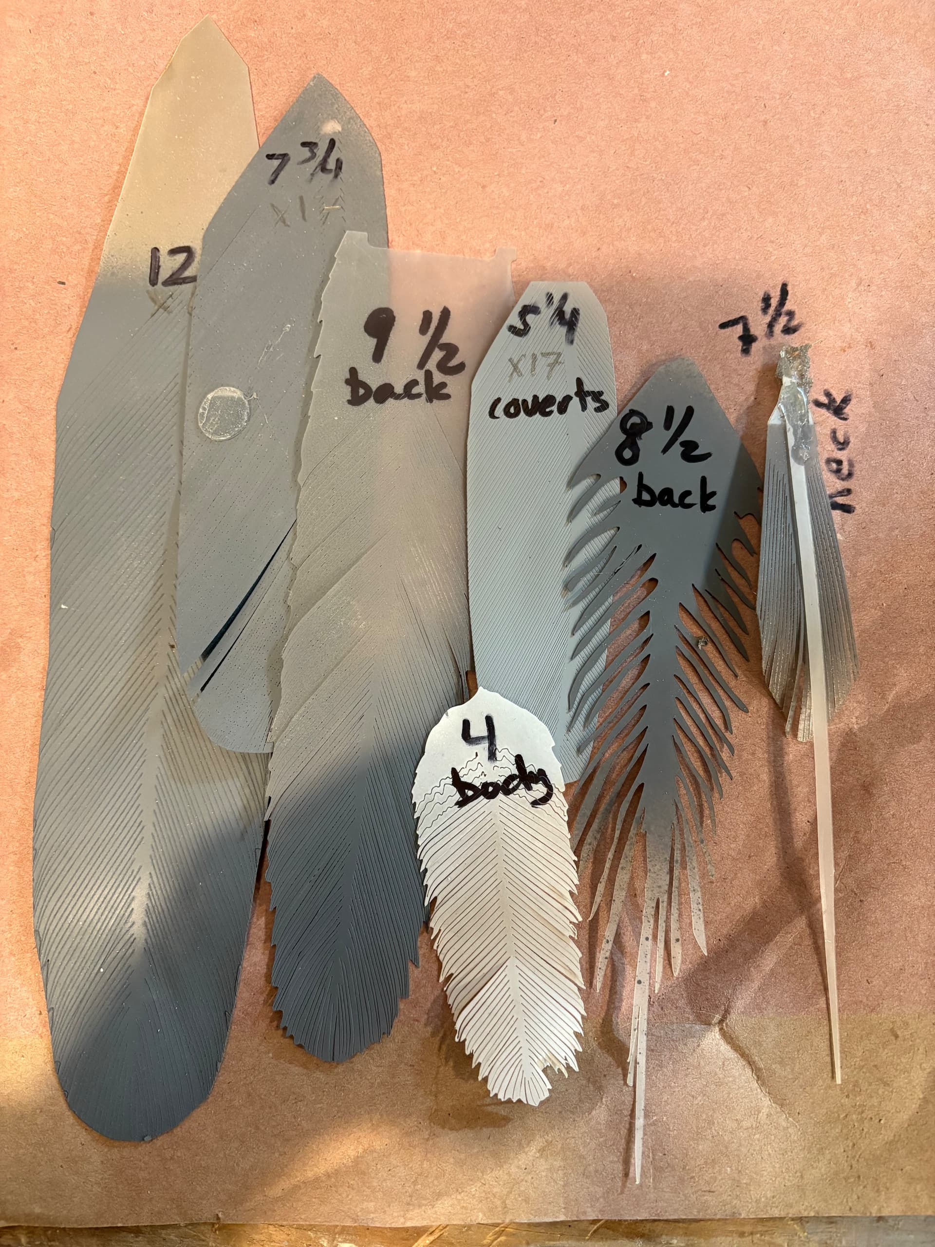 With all my projects I try to use only recycled, used, trashed, or otherwise discarded stuff. The birds are primarily made from plastic sheets found inside TV and monitor screens and rigid foam insulation used in walls and ceilings. I design the feathers and cut them on the Glowforge. (The material is safe to cut. I have been using it for years. I vent outside) They are then shaped with a small heat gun, painted and then glued on the body (foam). For a while I was counting the feathers and the Snowy Owl had 1006. Probably 500 of them were on the face! Here are a few of my latest birds with some ugly in process pictures. Have fun deciphering what’s going on. I have an instagram account for more background: thinking_out_of_context