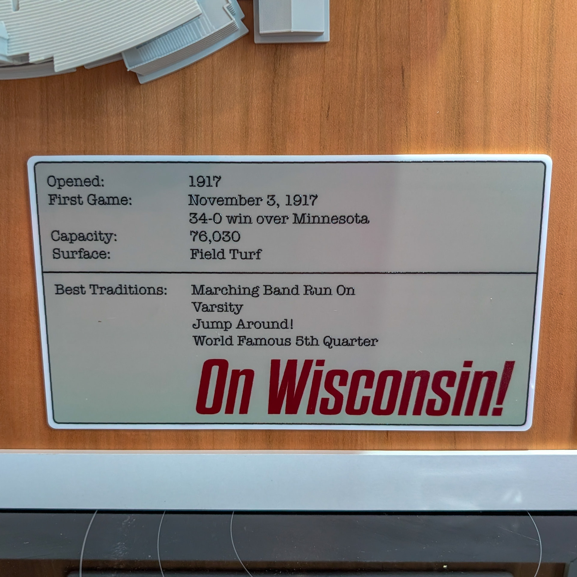 The stadium was 3D printed on a Bambu H2S. The field was UV printed on the eufyMake E1 on 1/16" MDF and the laser cut to size on the Glowforge using Snapmarks.