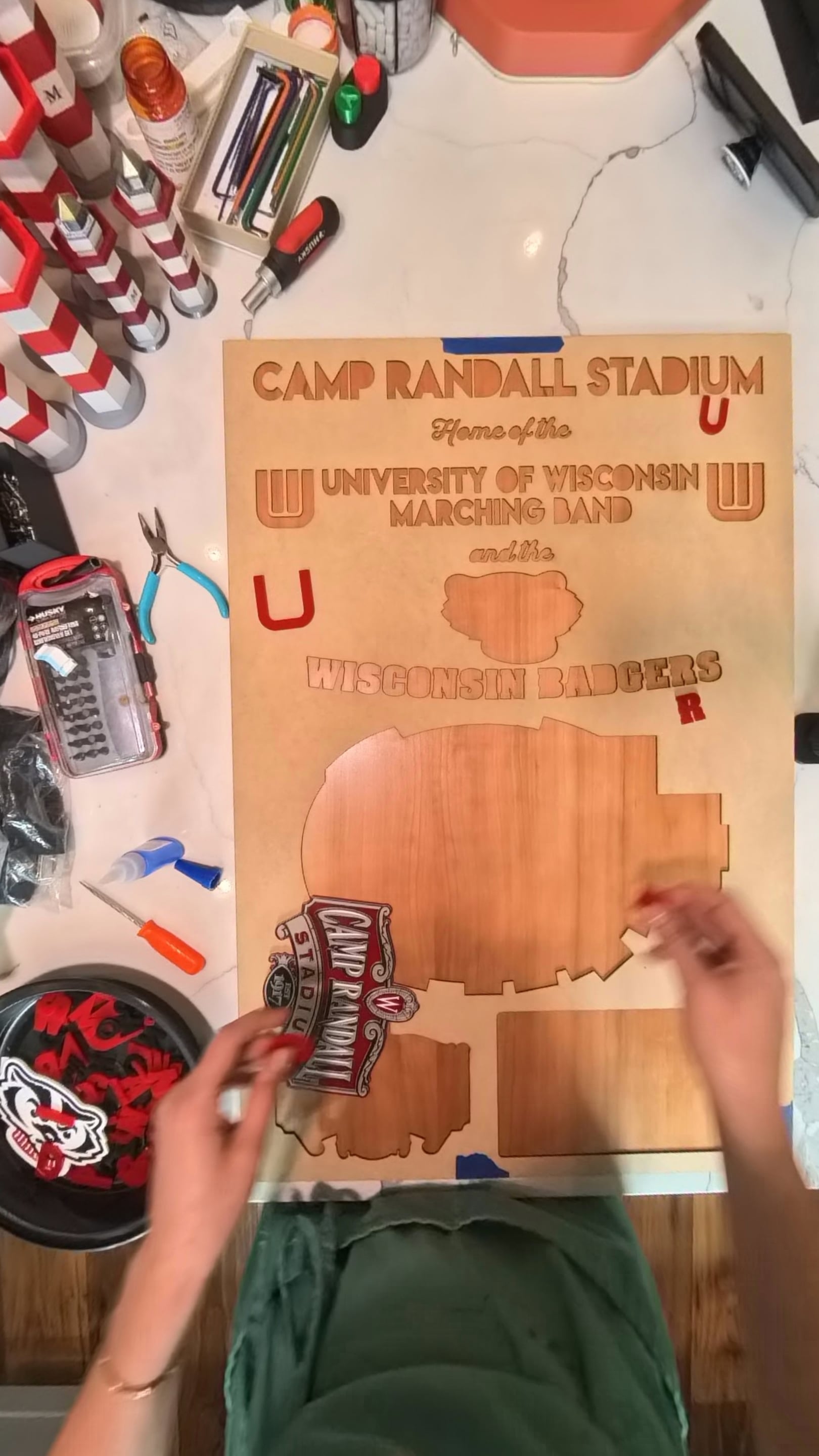 The plaques on the bottom, as well as the Bucky Badger were UV printed on acrylic, then laser cut to size on the Glowforge using Snapmarks. All of the letters were laser cut using acrylic on the Glowforge. The back is proofgrade cherry, and the stencil jig was 1/16th" MDF cut on my Mira 9.