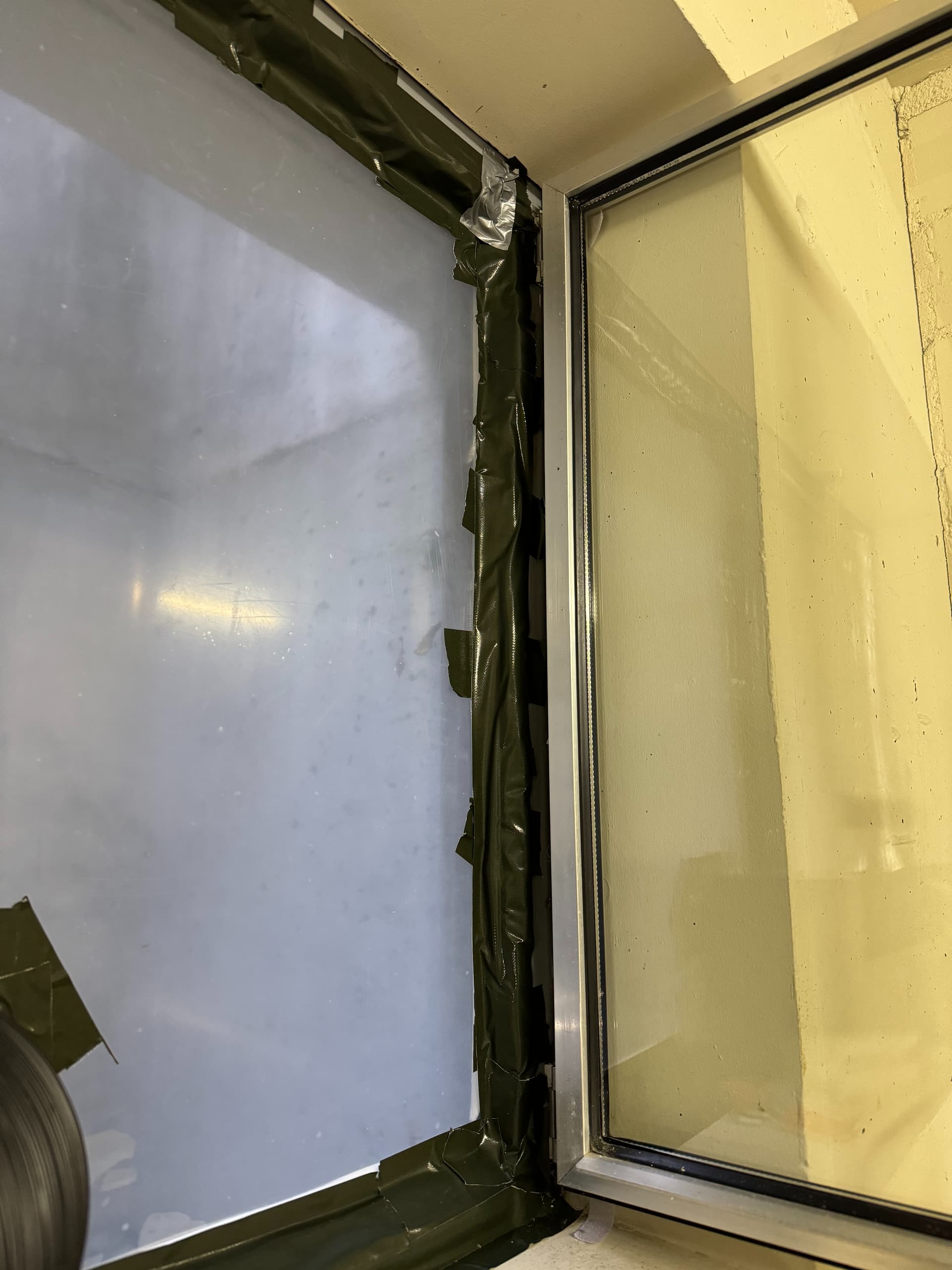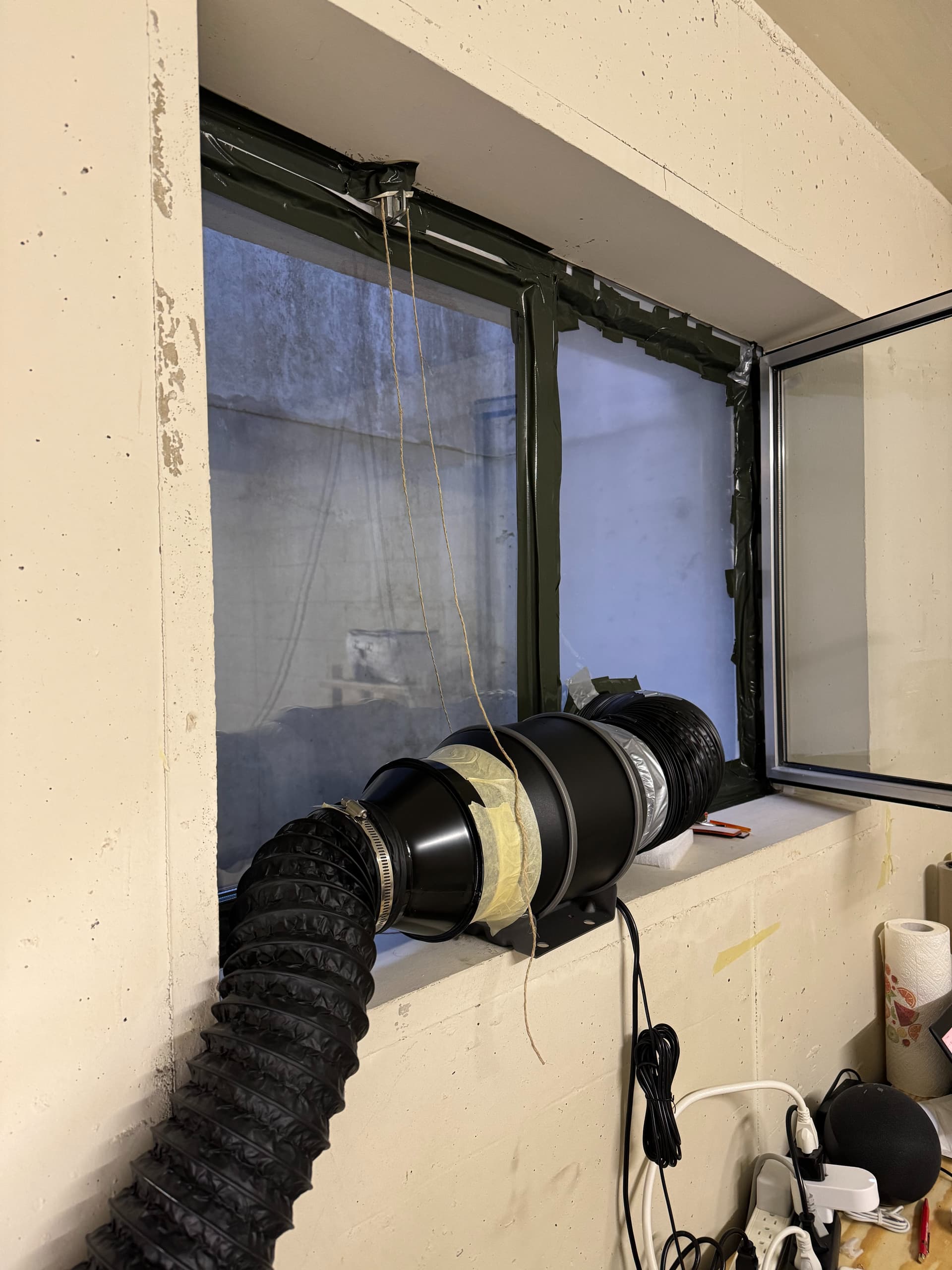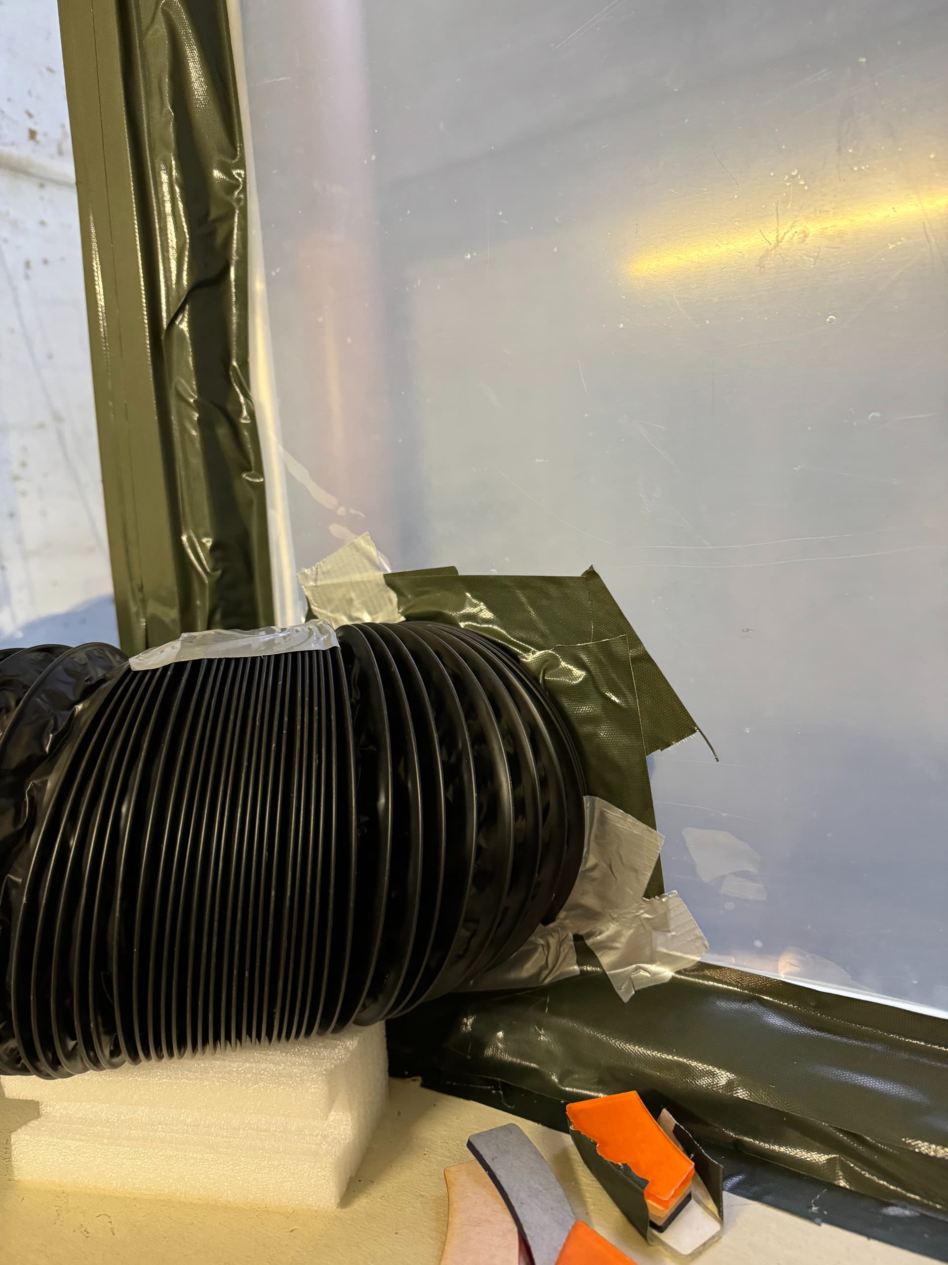 You’re pushing air out of your room, so more air needs to come into the room to compensate for that. It’s got to come from somewhere, and if there are any gaps in your window set up, you’ll be pulling fumes right back into the room when the Glowforge is running. Your window looks fairly well sealed with all that tape but windows are notoriously hard to seal completely.