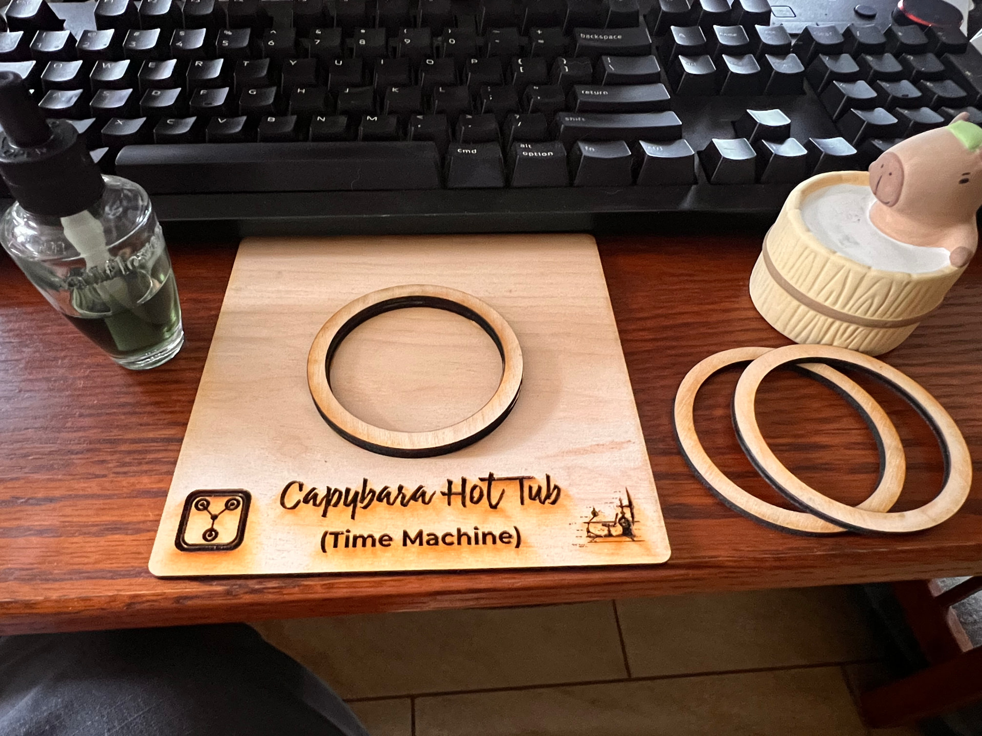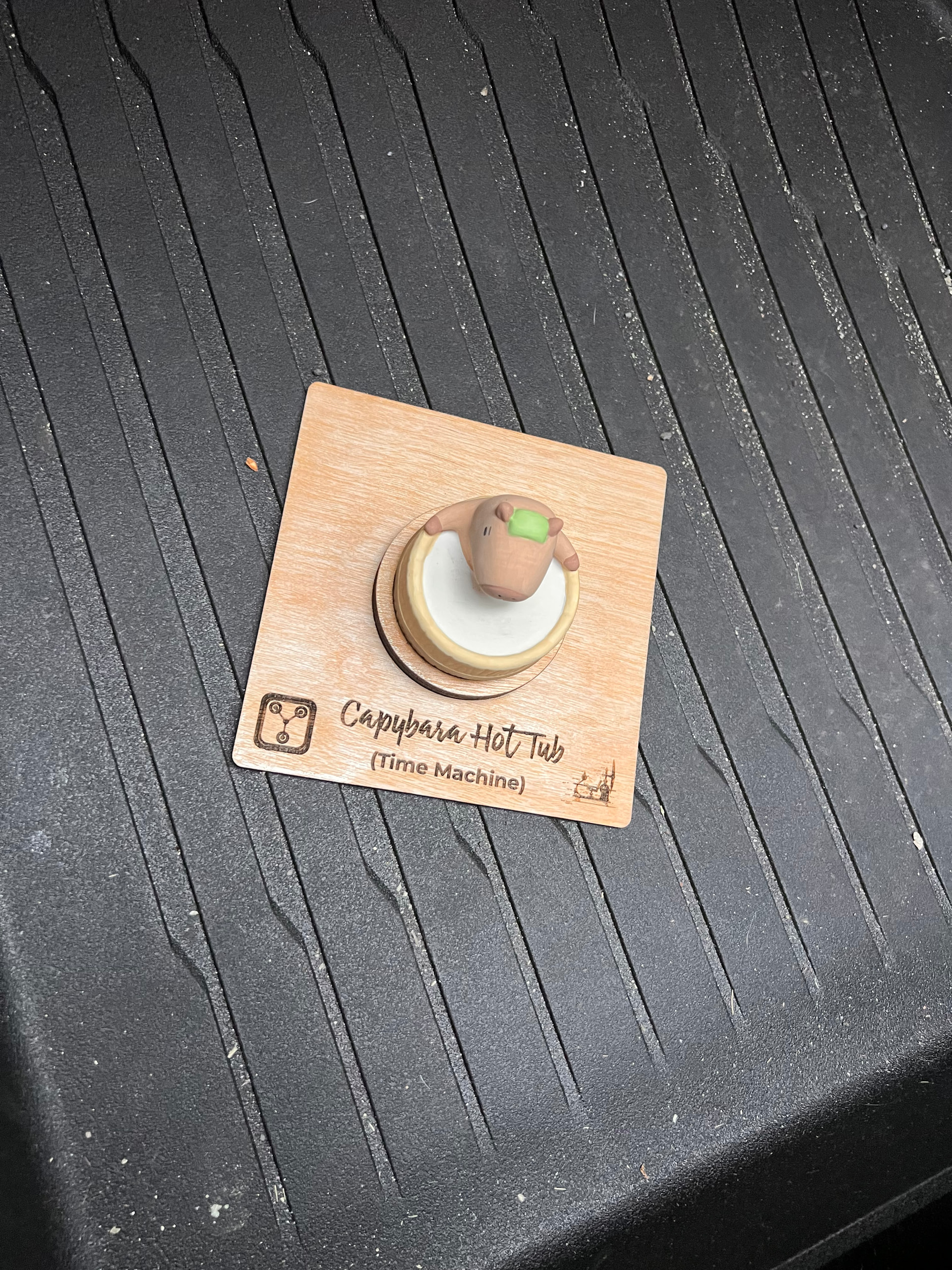 After the car was put back together it still had a unique cheesy aroma, so I had picked up some oil from a Bath and body Works oil diffuser after Christmas sale and thought I could leave one of those wallflower canisters just sitting upright in the car, but then it tipped over and it dissolved a little bit of plastic in the process, so I picked up a oil diffusing capybara from Amazon which is super cute, but I was afraid that it would roll around in the car so it needed a base, also to protect the car just in case the oil went straight through to the base.