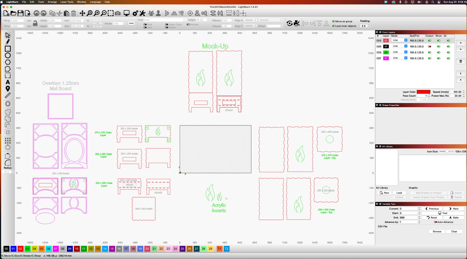 Use your design program for the SVG assets. I use Lightburn, and it does surprisingly well at annotating components and allowing a large design area. From my ‘Fire’ project -
