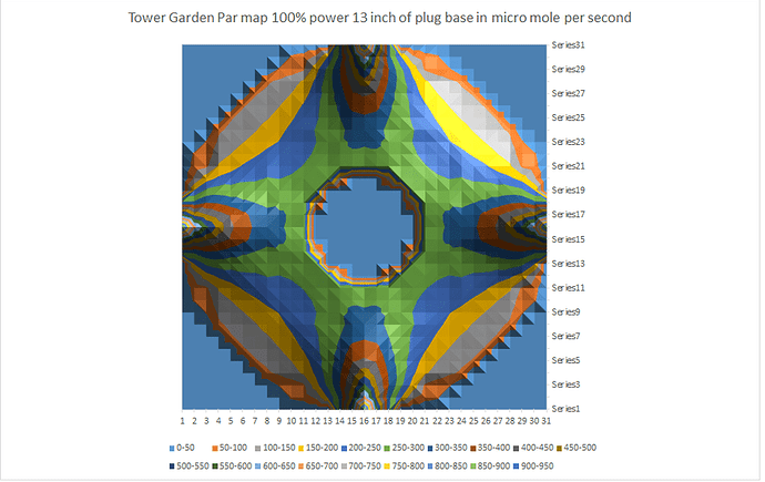 I am a dork and made a par map for my garden when I rented a li-cor quantum sensor last year so I could understand my settings eg as plants grow more they get close to the light and absorb more photons then they should when they are 13 inch away so I needed to know how to calibrate the lights for ech growth zone so they donāt get over juiced on DLI