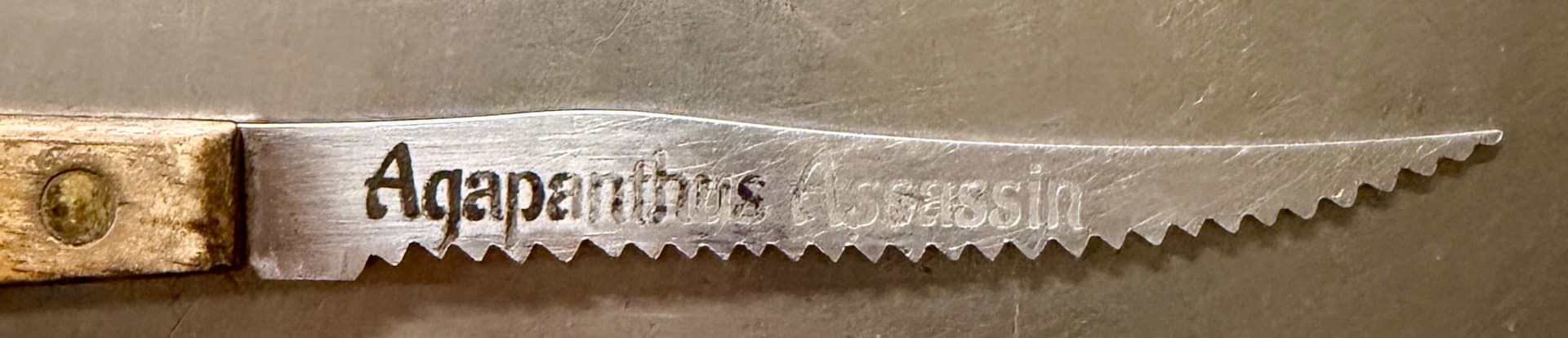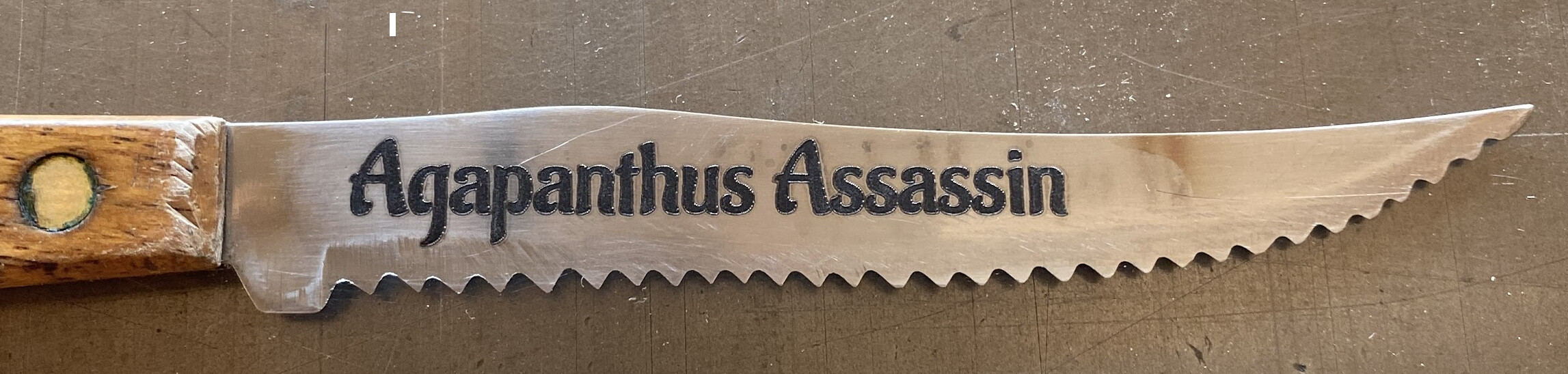 Well, back in Jun2021 I applied Yellow Table Mustard (it deserves capitalization because it works and is far cheaper that the other coatings) to the stainless steel blade of a an old serrated kitchen knife. Perhaps you can figure out from the pics the blade’s purpose. The engraving worked “as advertised” living a slightly raised “embossed” black substance. Would it hold up to intense removal of the invading Agapanthus plants? Yes (and no). While using my Agapanthus Assassin blade the other day I realized that the black embossed substance had been abraded to the point that is was no longer in/on the blade. But what was left behind was real, genuine engraving into the stainless steel! The engraved metal was gone — the engraved lettering was eaten into the steel! Isn’t this worth investigating further? I think so and challenge the engineers in our midst to explore further this phenomenon.