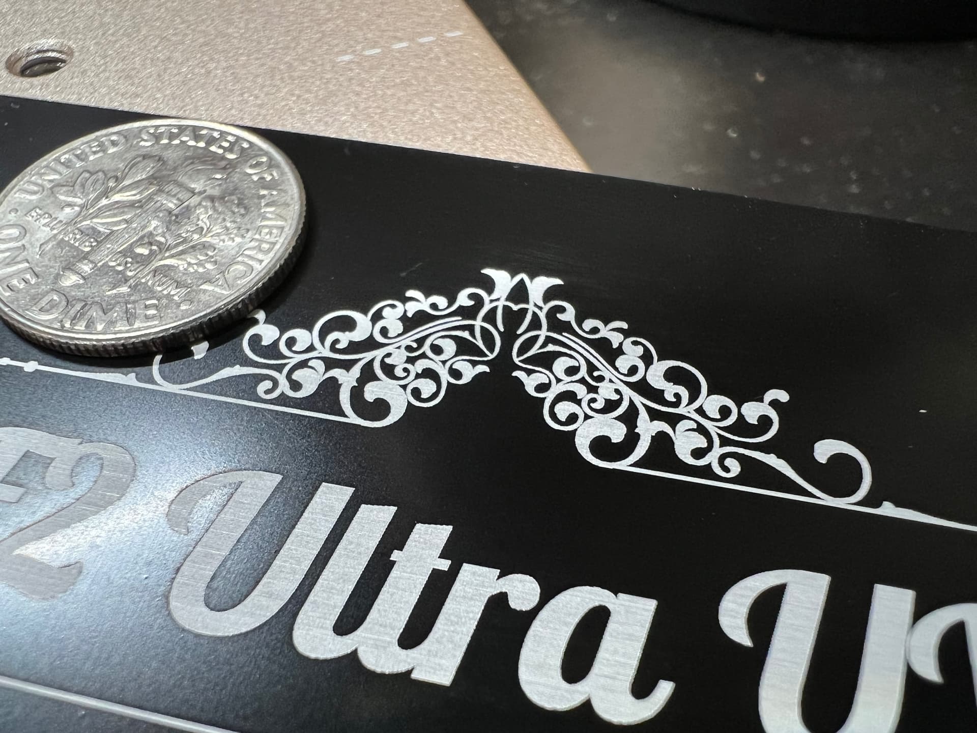 In comparison to what Glowforge did in the other thread the reduction in UV heat appears to have left the natural matte white color of aluminum intact. The Glowforge’s ablation heated the metal a goldish tint. It took some 20-ish seconds to engrave on the metal card for the F2 Ultra UV.