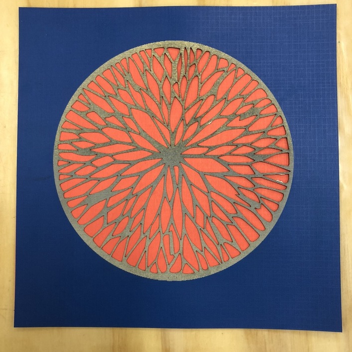 I went with super-easy and used blue painter’s tape on the corners. The air assist blew the small pieces out of the way, but I did keep a close watch in case of flare-ups. No problems. On another design I engraved today, I learned that engraving over the blue tape marks the tape but not the paper with the settings I used. Cutting goes right through the tape, though.