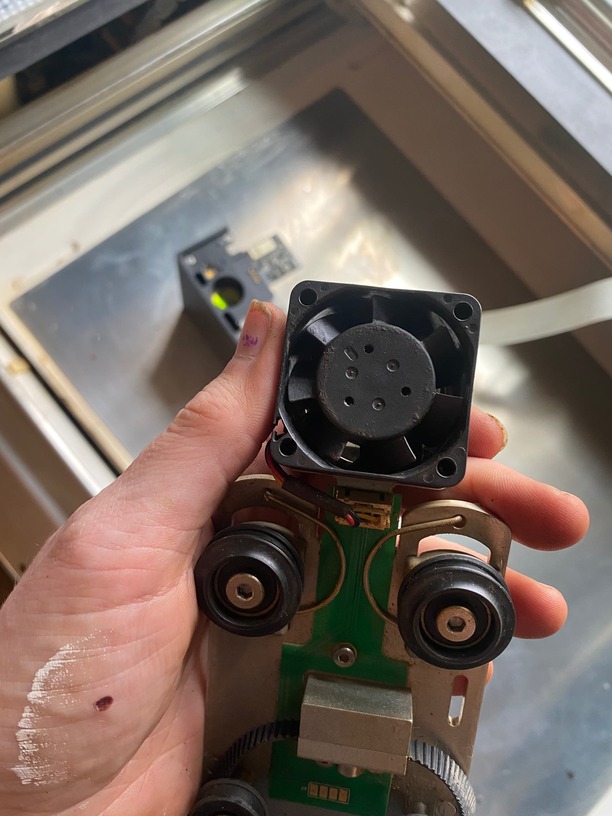 The fan is clearly not working, If doing acrylic that is very dangerous s acrylic will go up in flame very easily. I would test it on a scrap piece of wood and watch what happens to the smoke. If the smoke rushes straight to the front it is working correctly at that location. If you have the fan in a magnetic field the results will be similar.