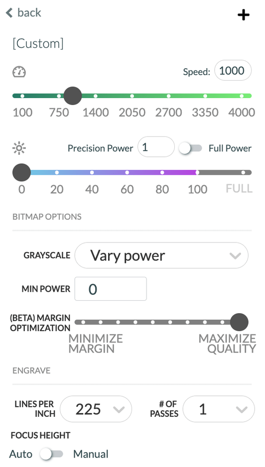 But with what you have, make sure you try out the “MARGIN OPTIMIZATION” slider you see on that raster engrave settings screen. It defaults to maximum quality, which is slowest. By engraving while the print head is slowing down or speeding up, you can capture a bit more benefit from that enhanced top speed you now have. Slide it towards “minimize margin” and – again, depending on your artwork – you may see the job time go down even further.