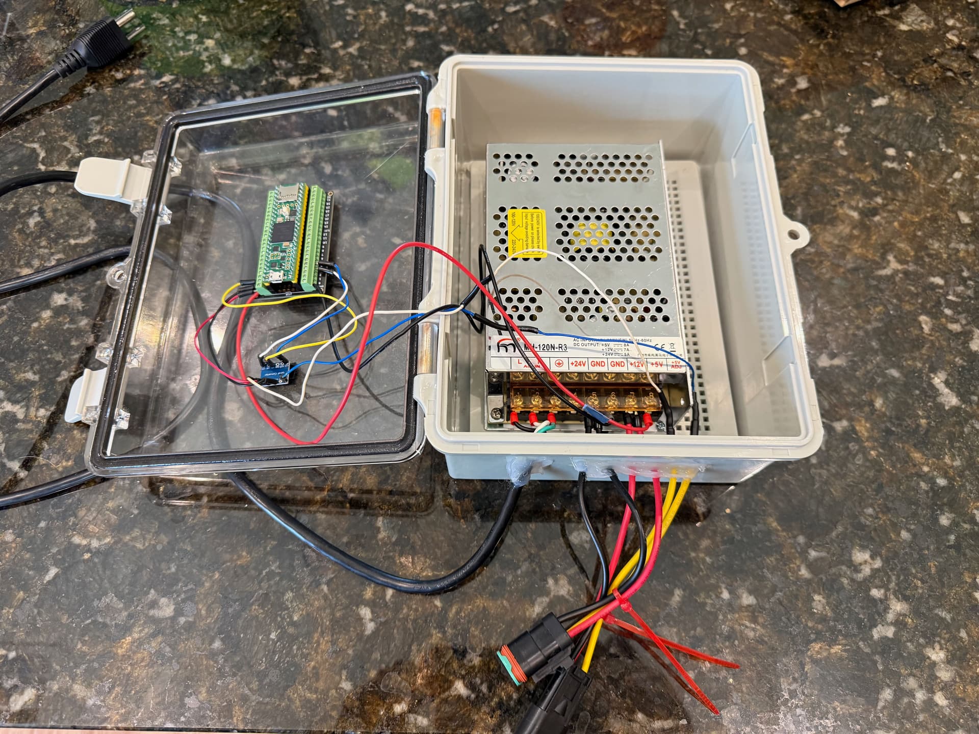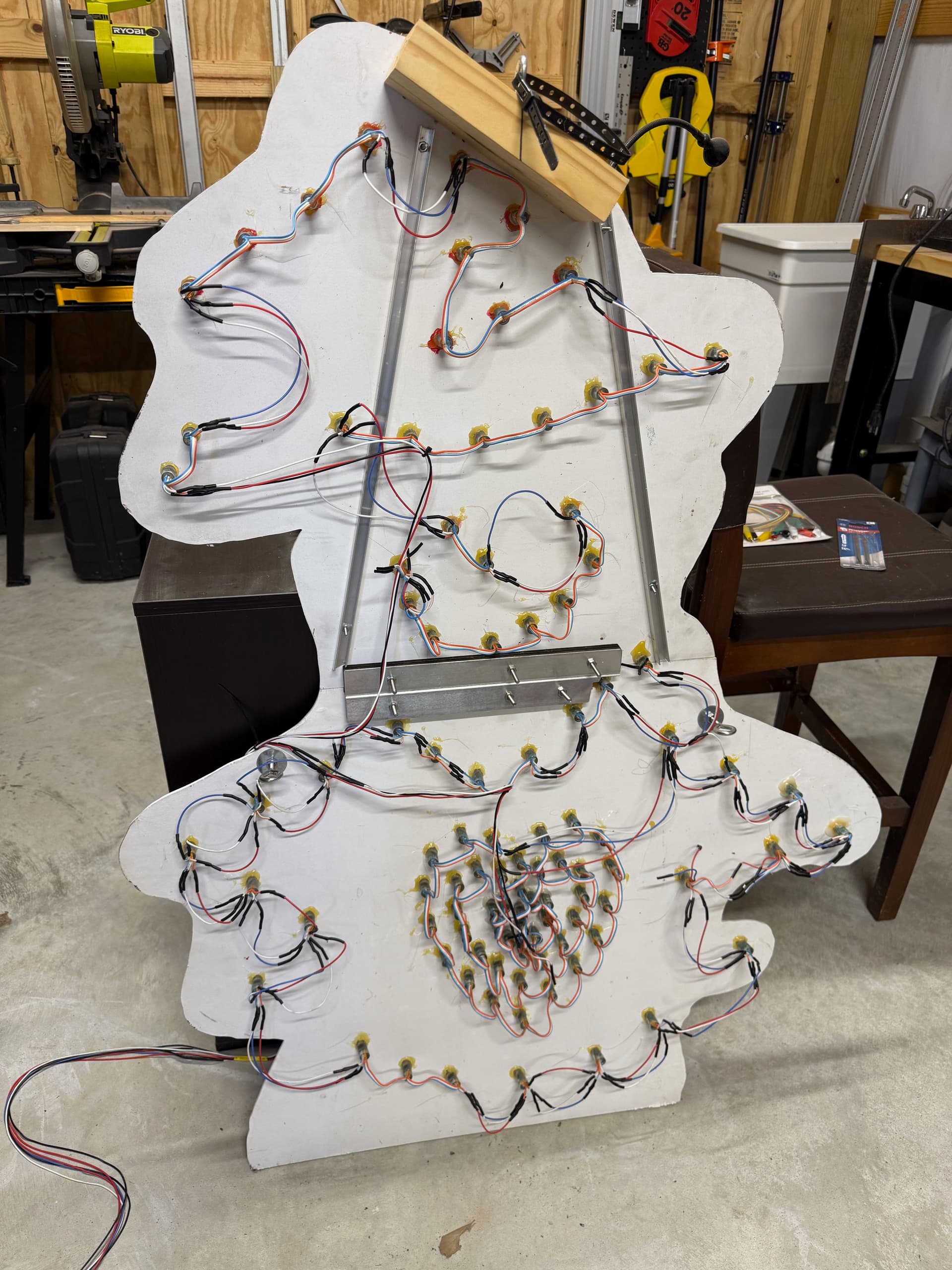 It wasn’t until I hung it up that I realized I hadn’t really used the color-changing aspect of the LEDs. For the most part they are just changing in intensity. It’s hard to tell from the video, but the white ones on the fluffy trim of his outfit actually do a twinkle effect where they randomly ramp up to full brightness and turn slightly blue. I worked on the code for that for half a day before I decided it was good enough for the year. I even tried using ChatGPT to help write the twinkle code, but it really didn’t understand what I was after.
