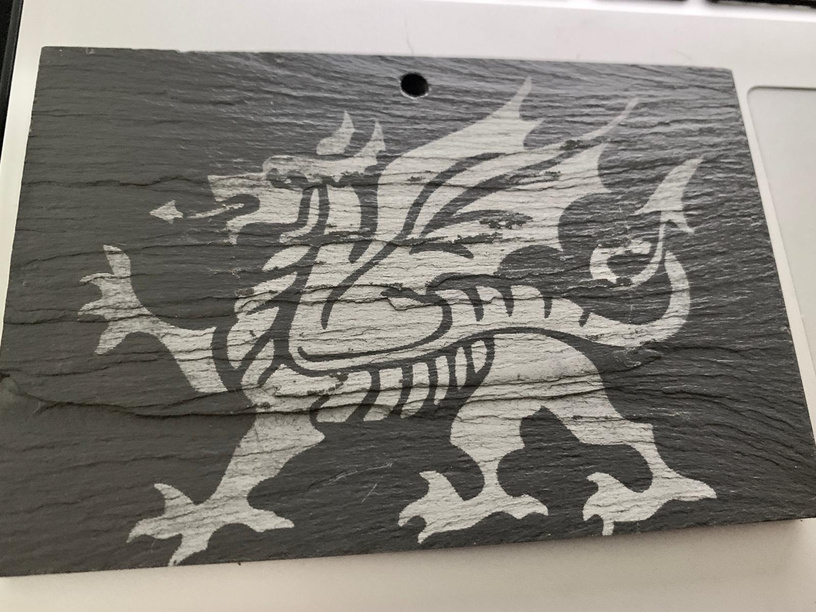 I have found that you get a much better contrast on Slate if you shoot it with clear acrylic spray paint (and let it dry) before engraving. It makes the Slate permanently darker like it’s wet, and where the laser hits it I think it tends to be “whiter” because of the acrylic. (I thought I had a picture of a recent print where I did this, but I couldn’t find it).