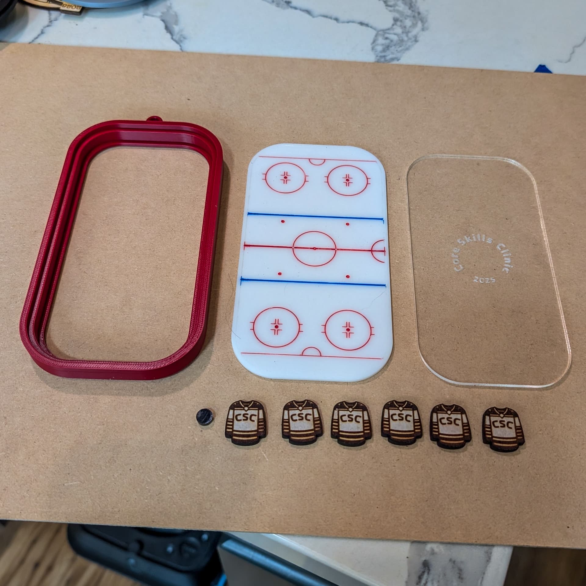 Ornament commission of upcoming Hockey club holiday party. Combination of 3d printed frame and laser cut acrylic and wood.
