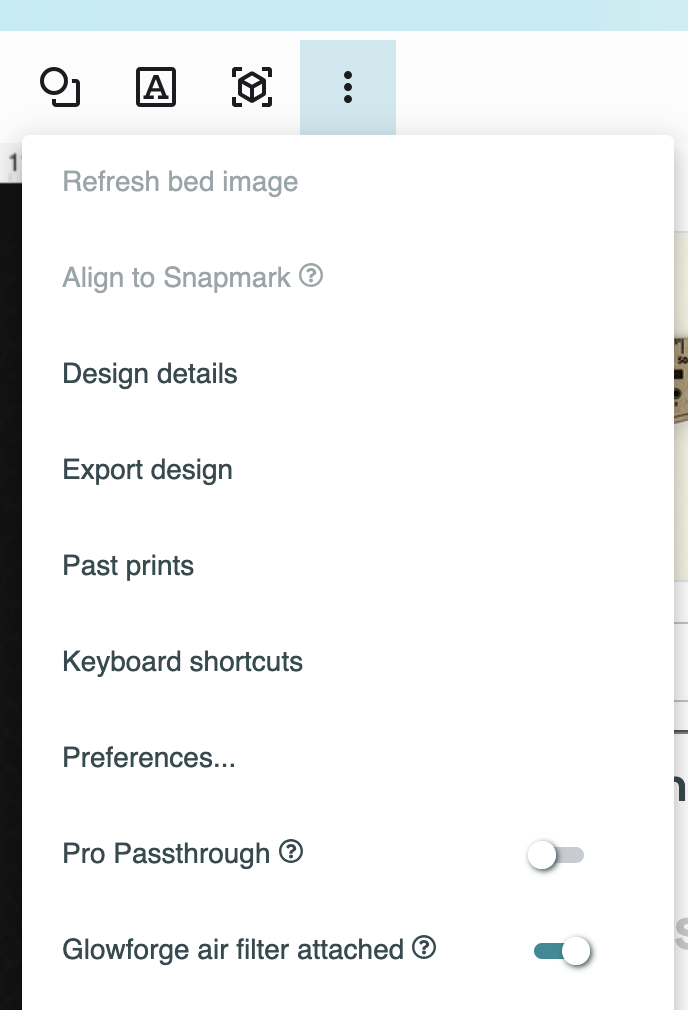 The only fan you can control is the exhaust fan at the rear of the machine. Click the three dots in the interface and toggle the filter to on.