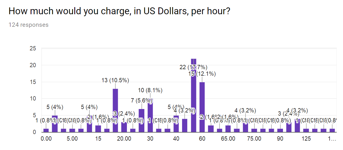 Observation: biggest around $50-$60/hour, which is what most maker spaces charge, and a smaller one around $15-$30/hour, which is what people typically make driving for Uber or Lyft (gross, not net of Uber fees, gas, etc).