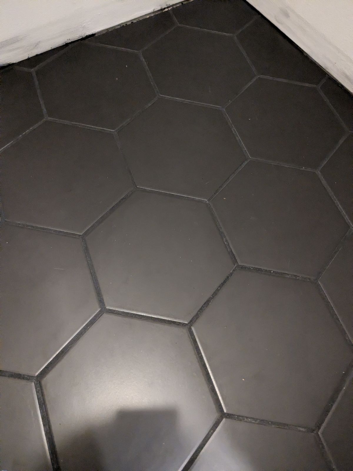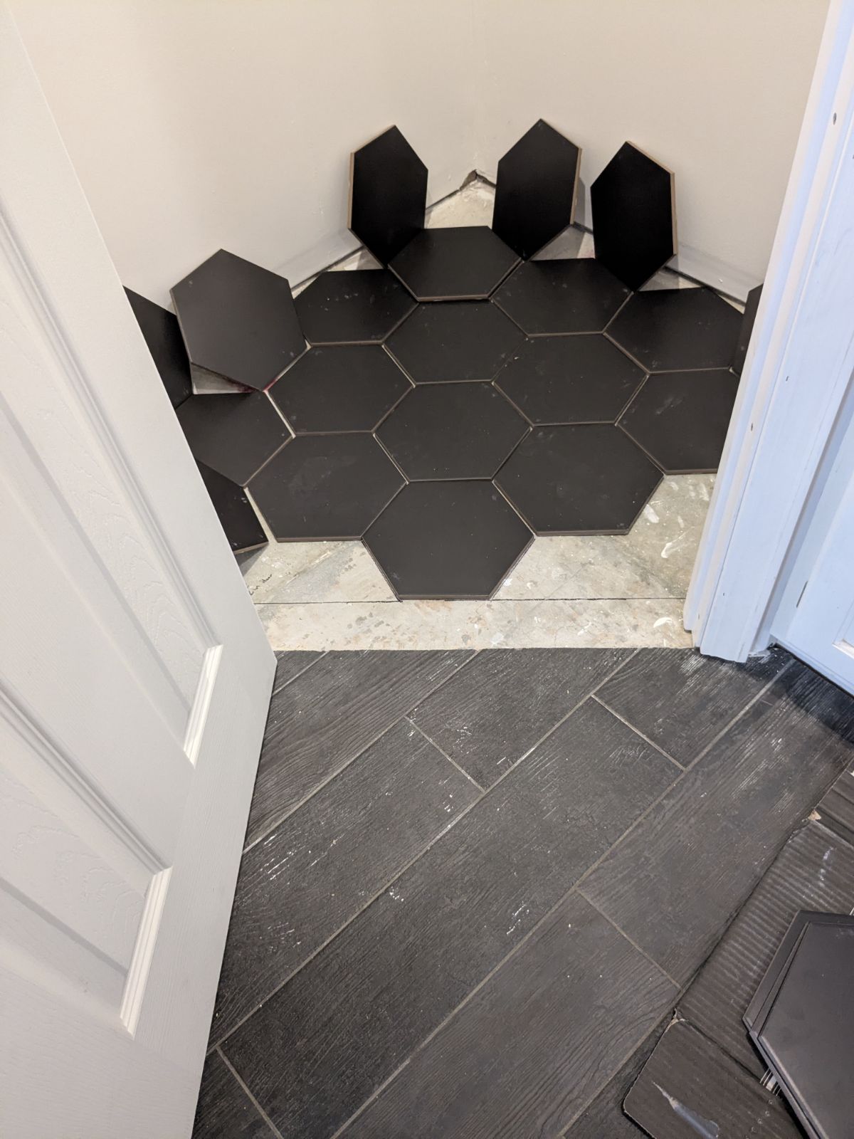 Tada! Perfectly good enough for a new built-in pantry floor! Also, even though I love hexes, I am so glad that I got to try laying them out in a small space, because getting them truly lined up was a minor pain, and doing it on a larger project would have been a unwelcome hassle
