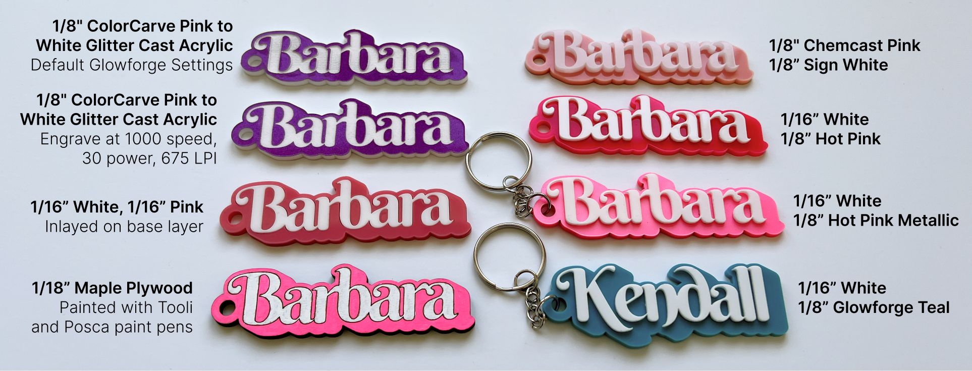 I cut the above examples from 1/16" White Cast Acrylic for the top layer (I recommend using a thinner acrylic for the top, looks a lot nicer IMO) and then 1/8" Cast Acrylic for the bottom. I used Metallic Hot Pink from Houston Acrylic (Barbara) and Glowforge Proofgrade Teal (Kendall).