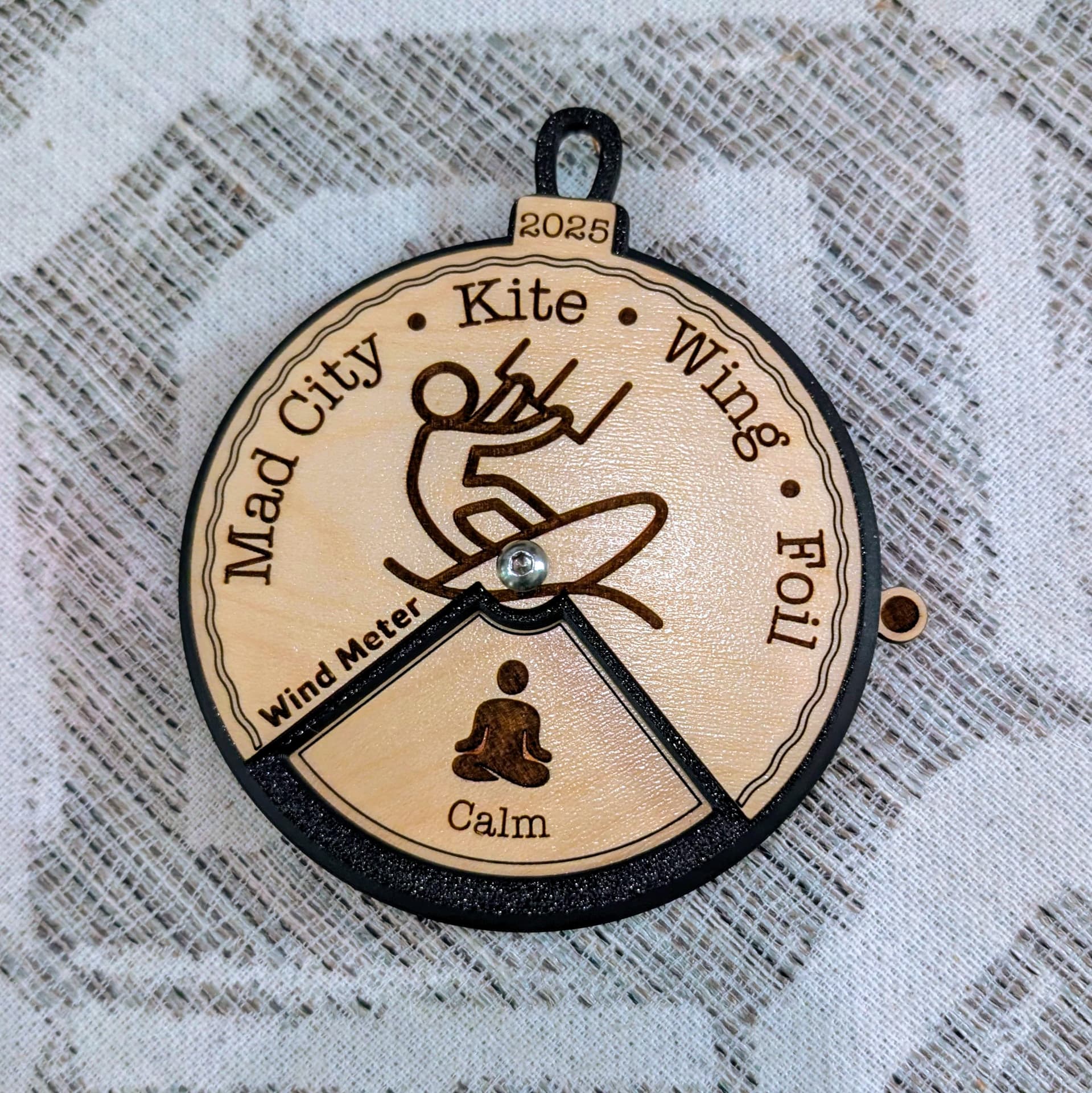 Ornament commission for an upcoming holiday party of kiteboarders, wing boarders, and foilers. Suppose to mimic a fake wind meter showing wind conditions. Combination of laser cut and 3D printed parts.