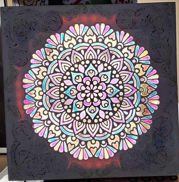This is the first project I’ve posted on here. I decided to see how far I could push the Mandala in the free files. This was a long pain staking process of painting each individual piece and then placing them into the frame. Added some USB LED strips on the back and gave it an aged look. It was a lot of fun. I’ve had my Glowforge a little over a month. Can’t wait to move on to the next project.