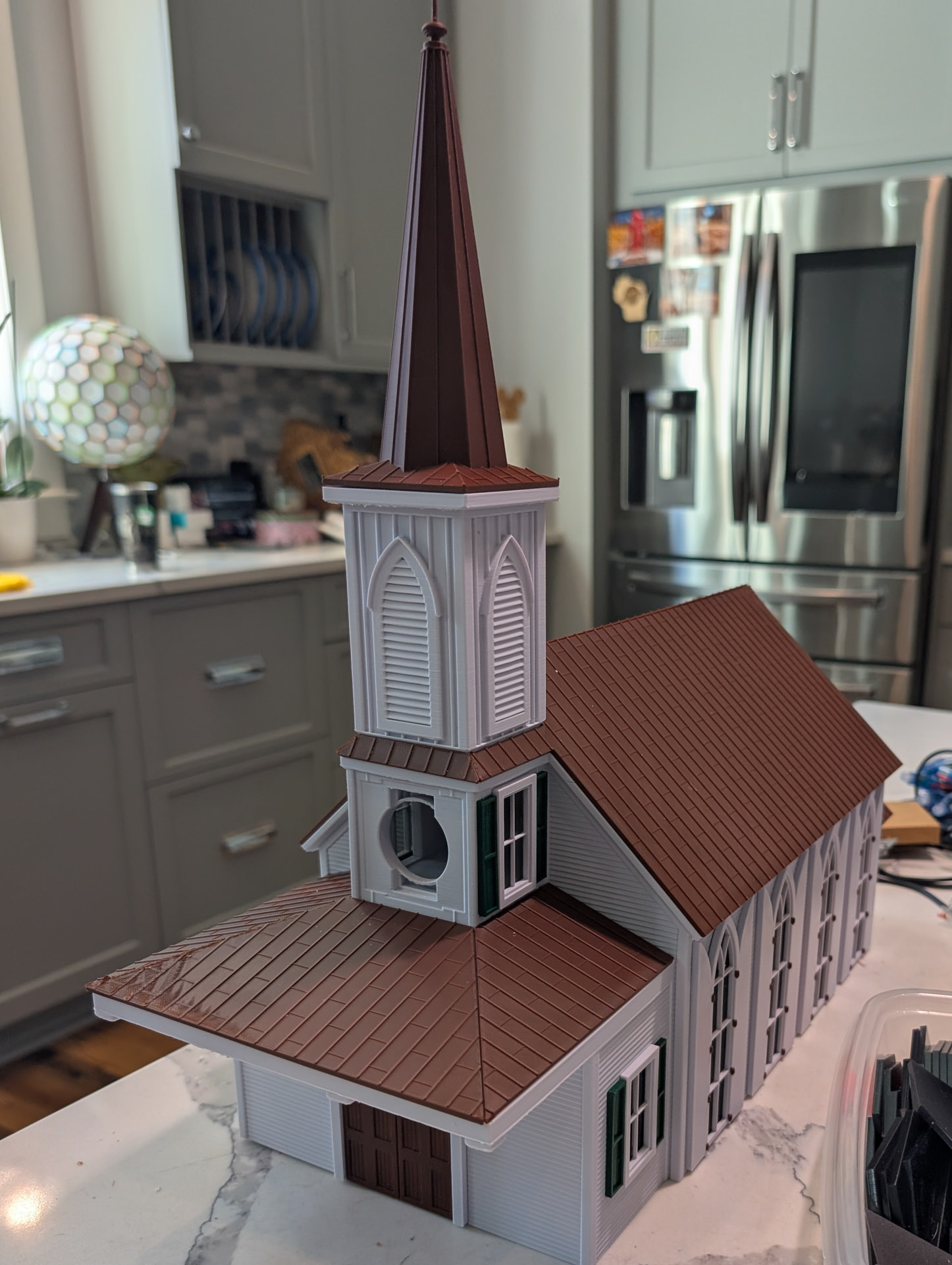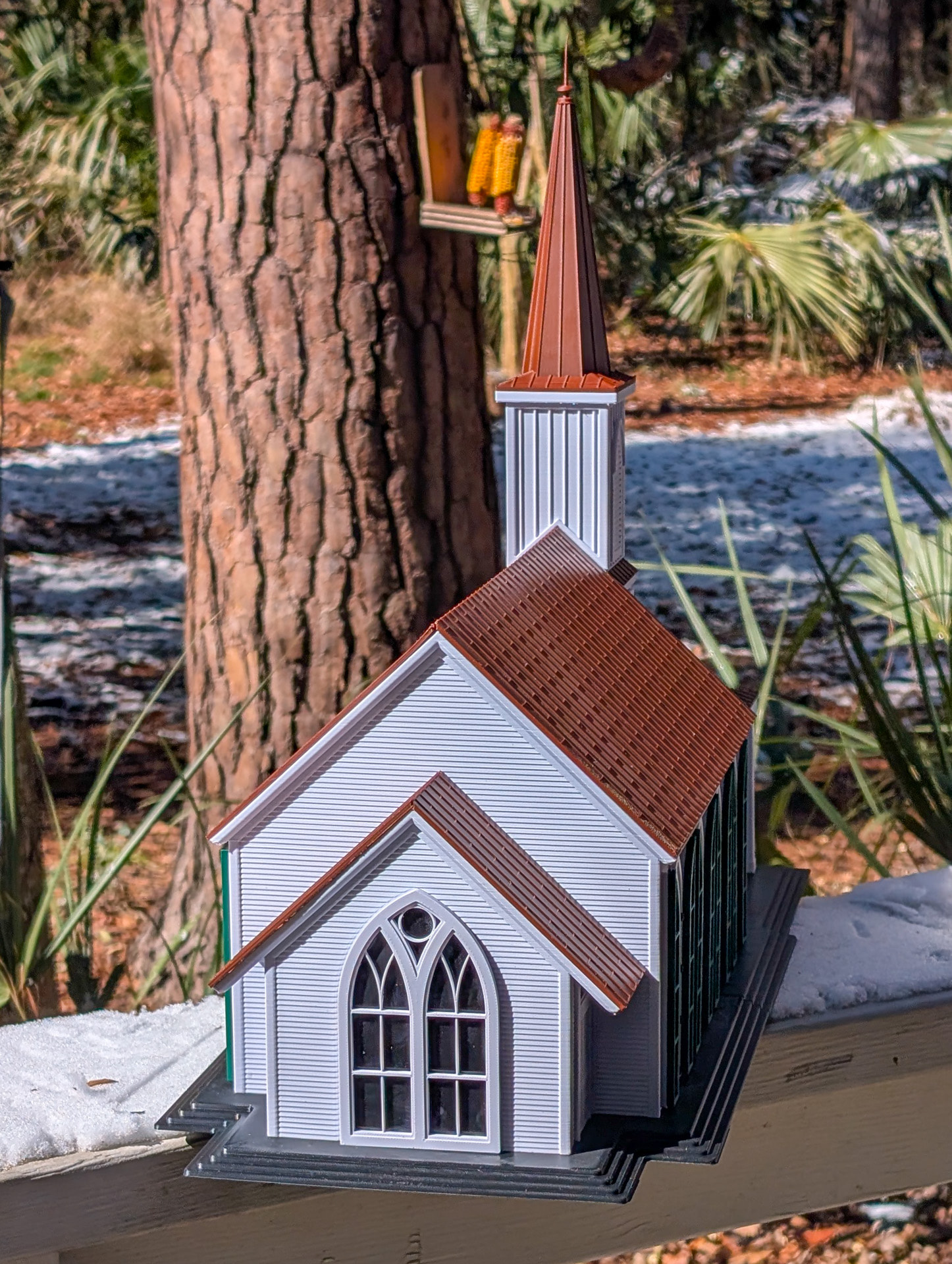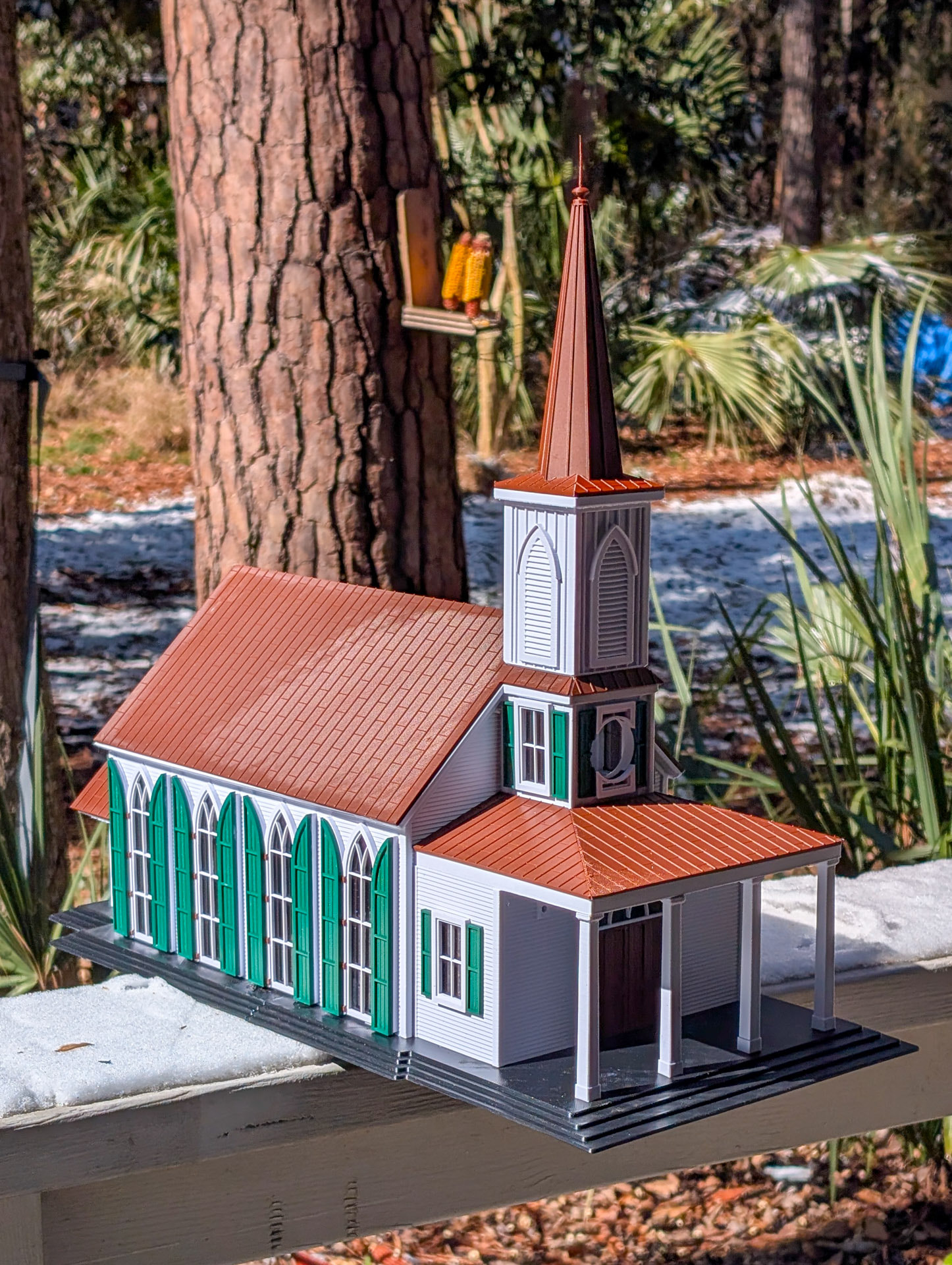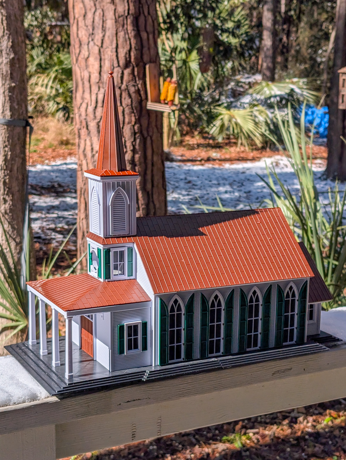 Please note that a majority of the build was 3D printed, and the only parts cut by the Glowforge were the acrylic windows. After doing a local iconic church as a birdhouse, I was asked to do the May River Chapel which is located in the upscale private community of Palmetto Bluff outside Bluffton, South Carolina. I designed this only using pictures found online using Fusion 360 with mostly 3d printed ASA filament parts. The windows are laser cut translucent grey to allow some light in the birdhouse. When it warms up, I’ll go take a picture of it in front of the actual church.