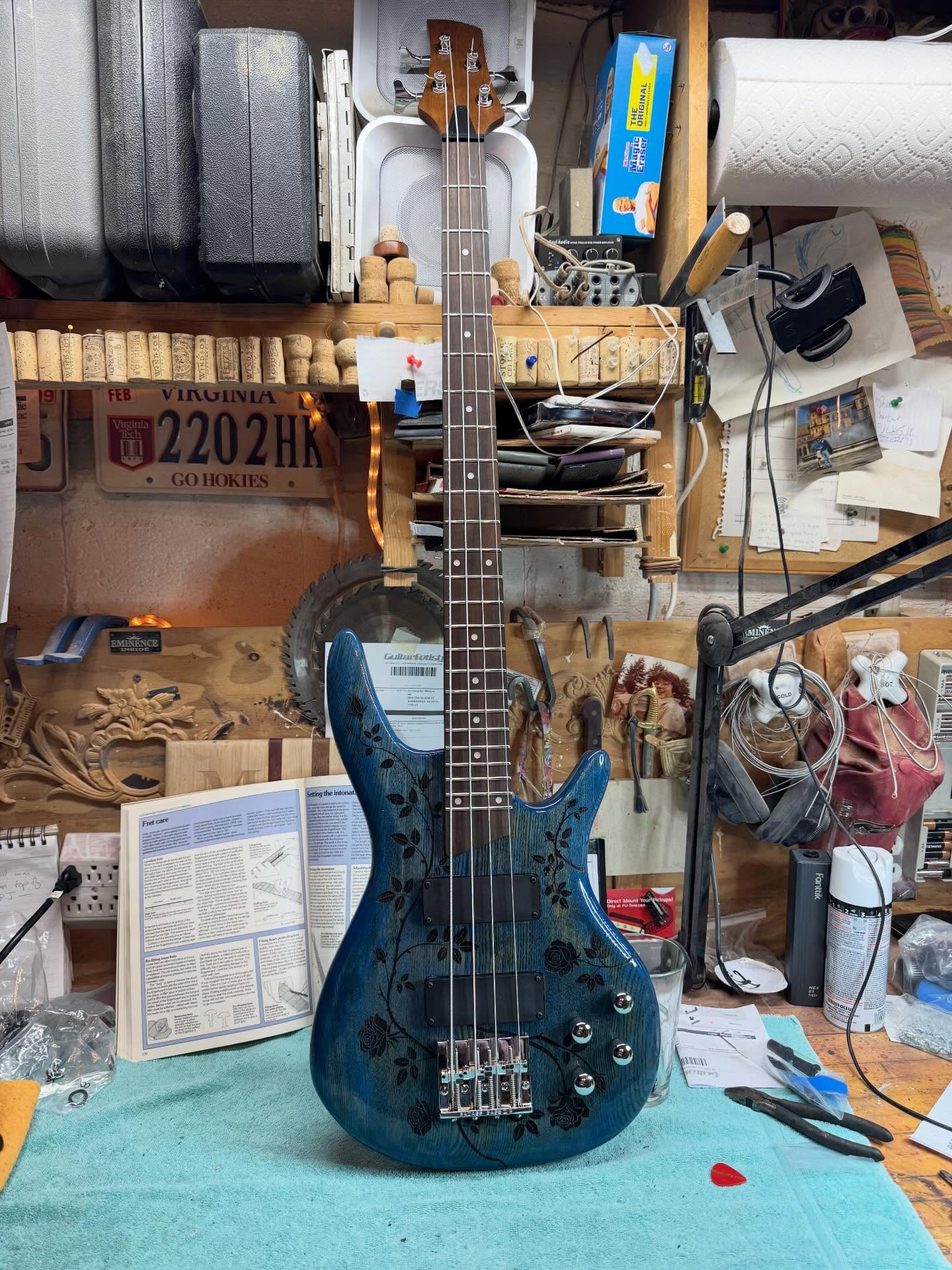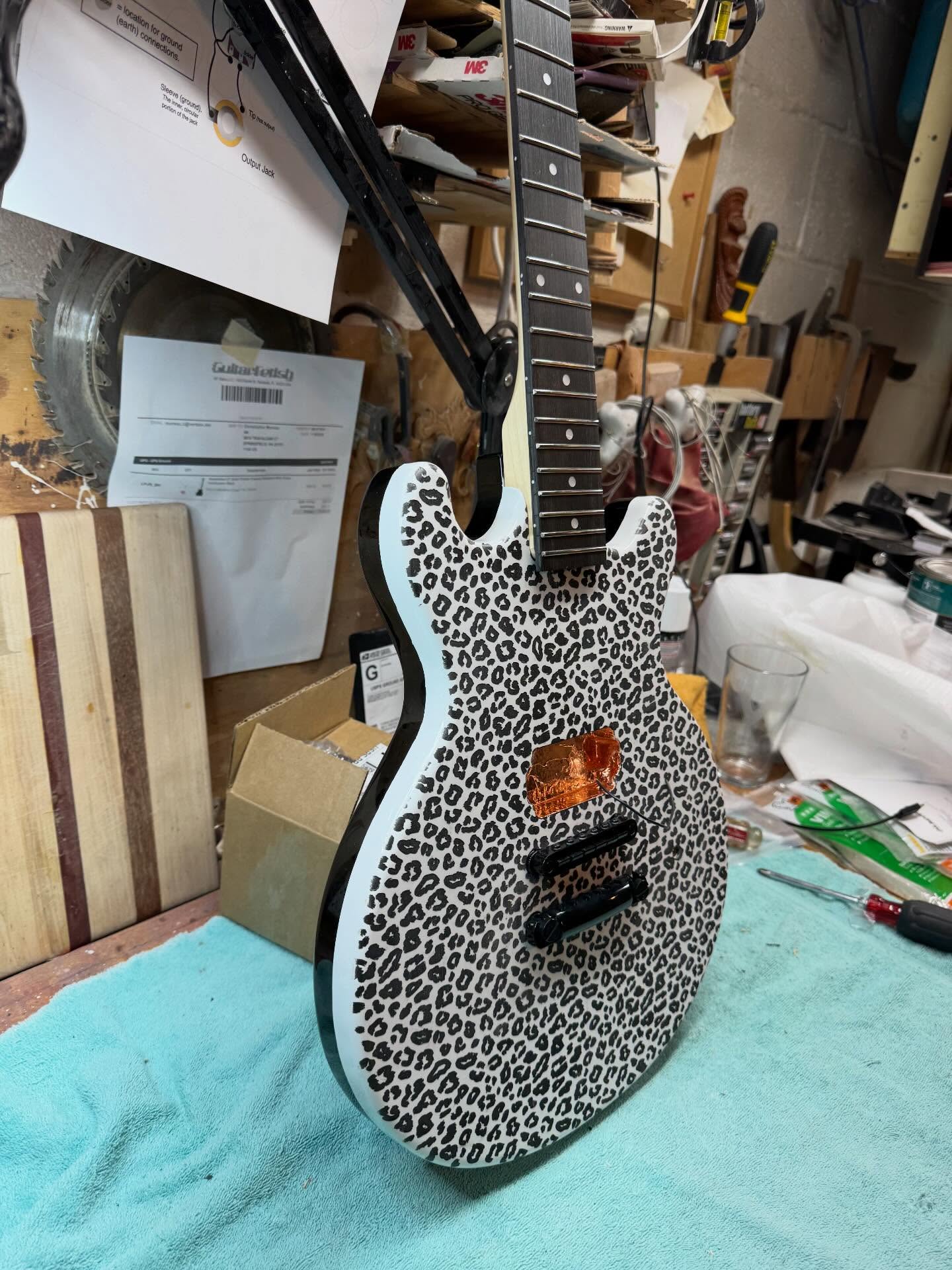 Next up: a variation of the leopard skin guitars we did for Tracii Guns to sell at LA Guns shows on their last tour. This one a “white” leopard for Jack Frost (another heavy metal guitarist, one of the original founders of seven witches). He wanted it black on the back and white on the front, so kind of like a black and white cookie. we started with a black guitar and had an auto body shop paint the front half after masking it. then engraved.