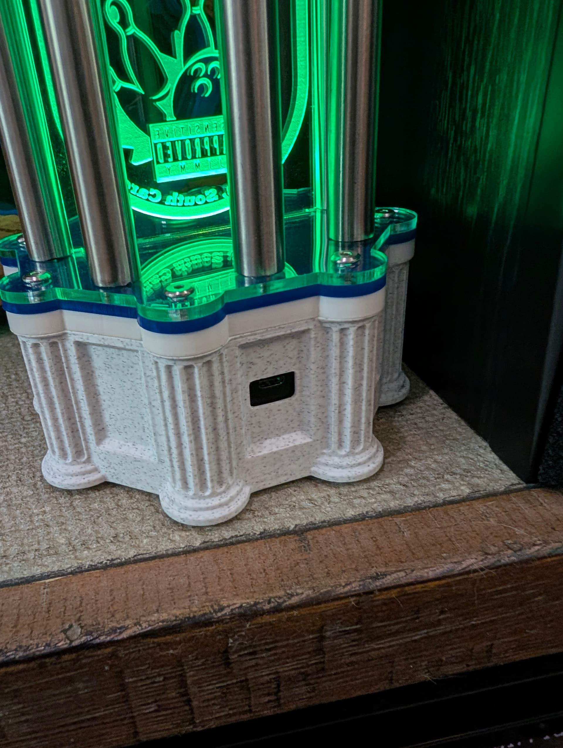 A couple of years ago, I made a bowling trophy for a fake bowling tournament when some friends came to visit me in South Carolina. Beers consumed, memories revisited, fun all around. We’re doing it again this fall, so I made yet another trophy. But this time I integrated an LED lamp into the design. 3D printed base and bowling pin with marble PLA, with laser cut and engraved acrylic. I added 100mm standoffs to give it a professional look and voila! It lights up and stuff…