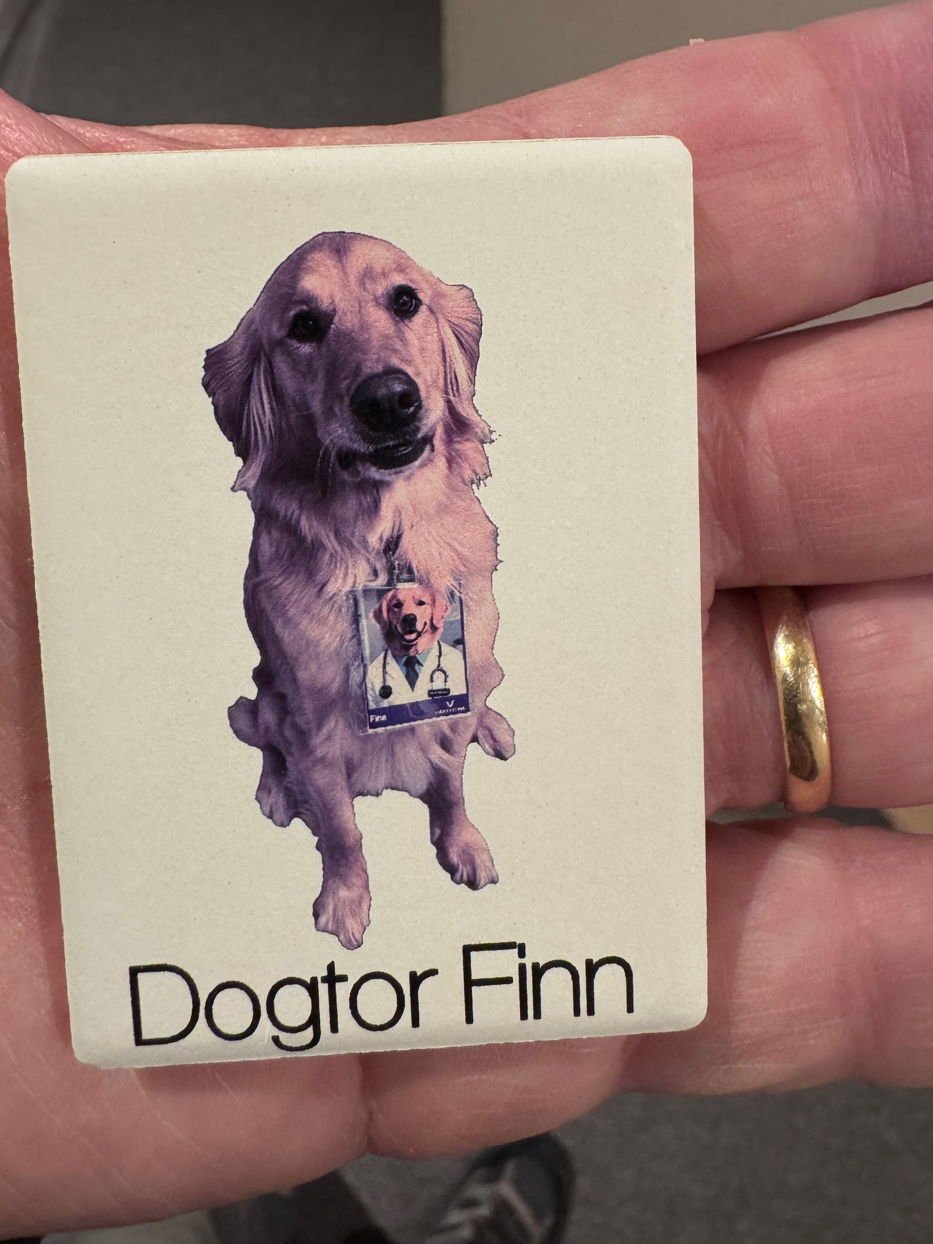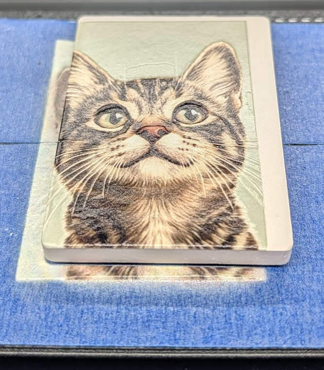 First Print was from my wife’s work, where she brought the dog and got him an ID. He was so proud of his ID and walked around the hospital showing everyone. (the cutout I didn’t do anything fancy with photoshop of some other high quality tool, I just used the cutout in the app hence the aliasing in the border). That is a non-textured print. At some point I need to read how far it can go around a corner or such, but in their demo it shows printing custom golfballs so fairly curved surface. This test print took about 3 minutes.