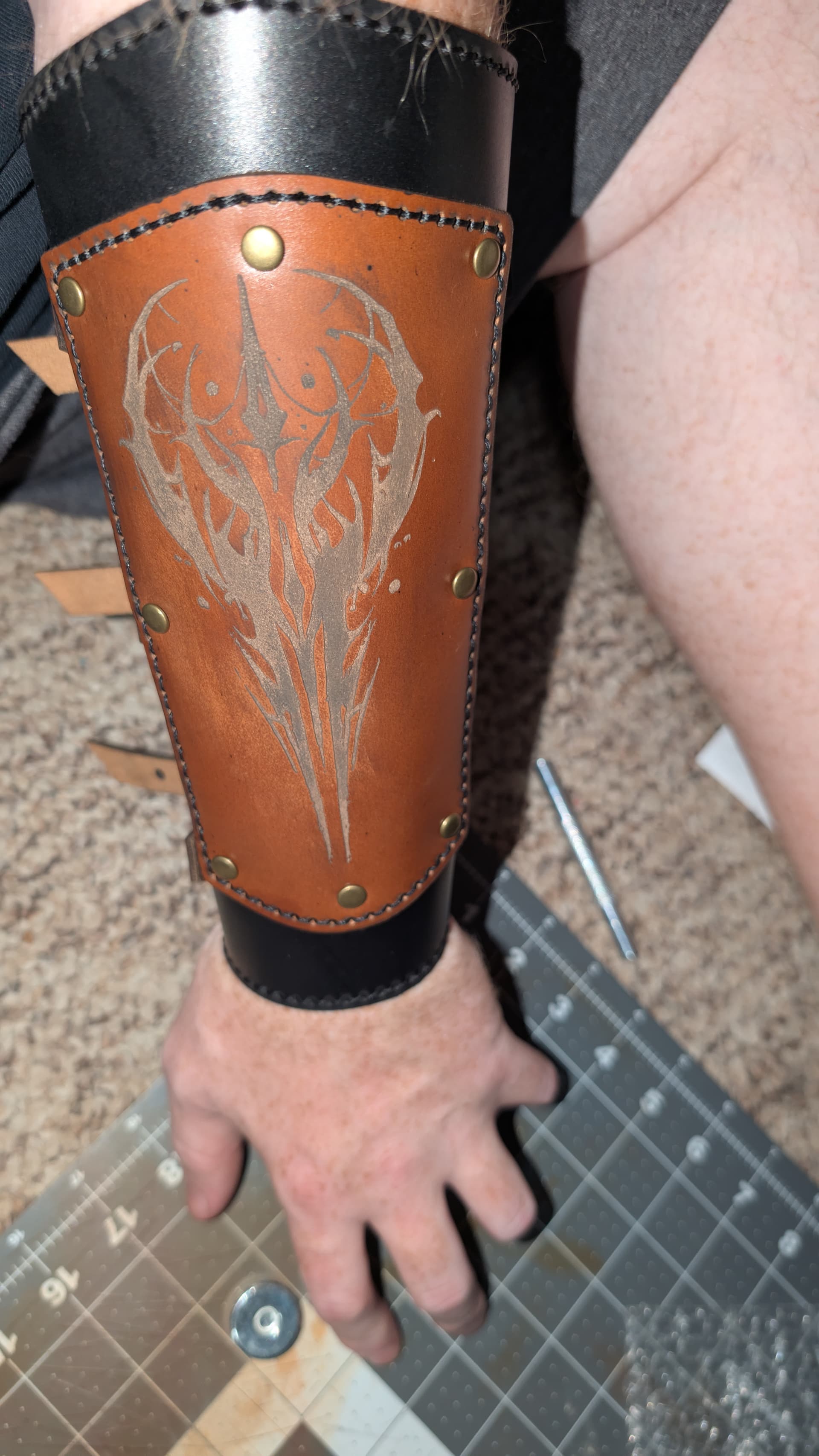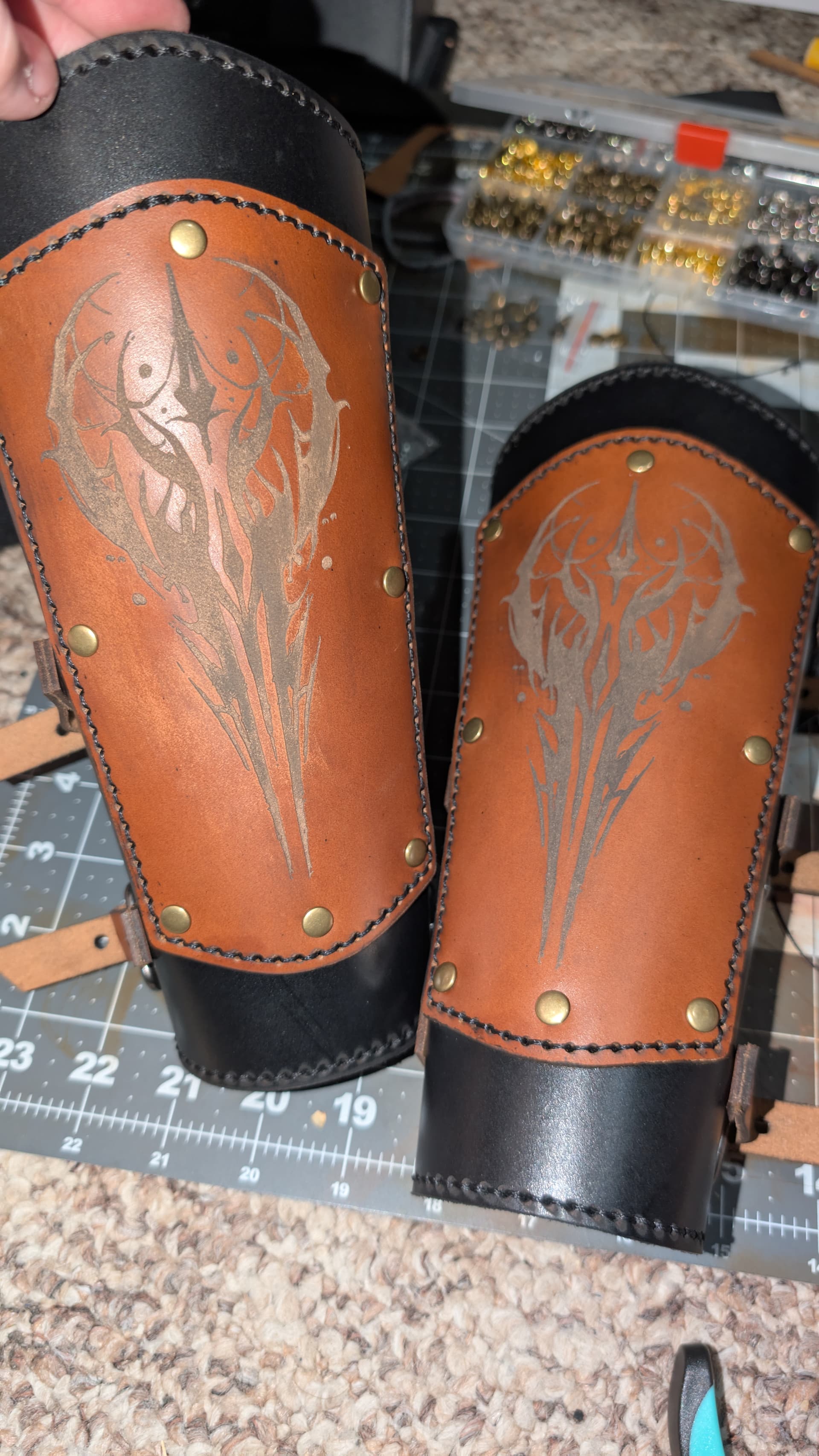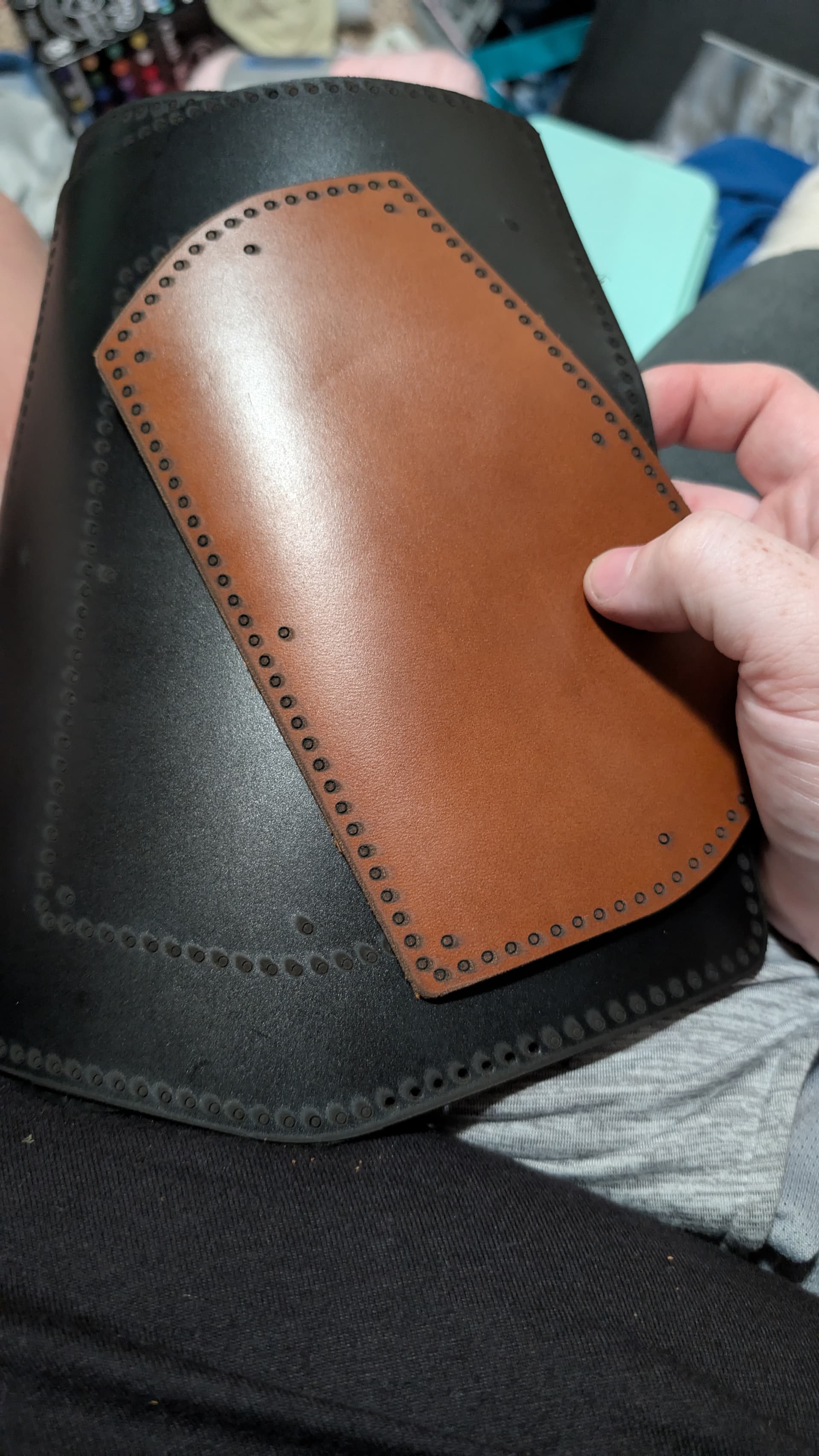 A few things I’m going to have to modify for this based off of how it looks now that it’s fully assembled: first and foremost, I need to make some small leather loops to hold down the straps when they are fully buckled.