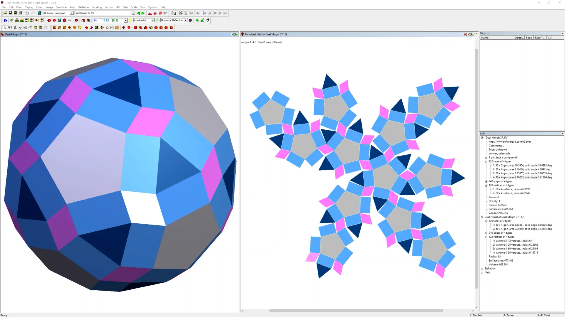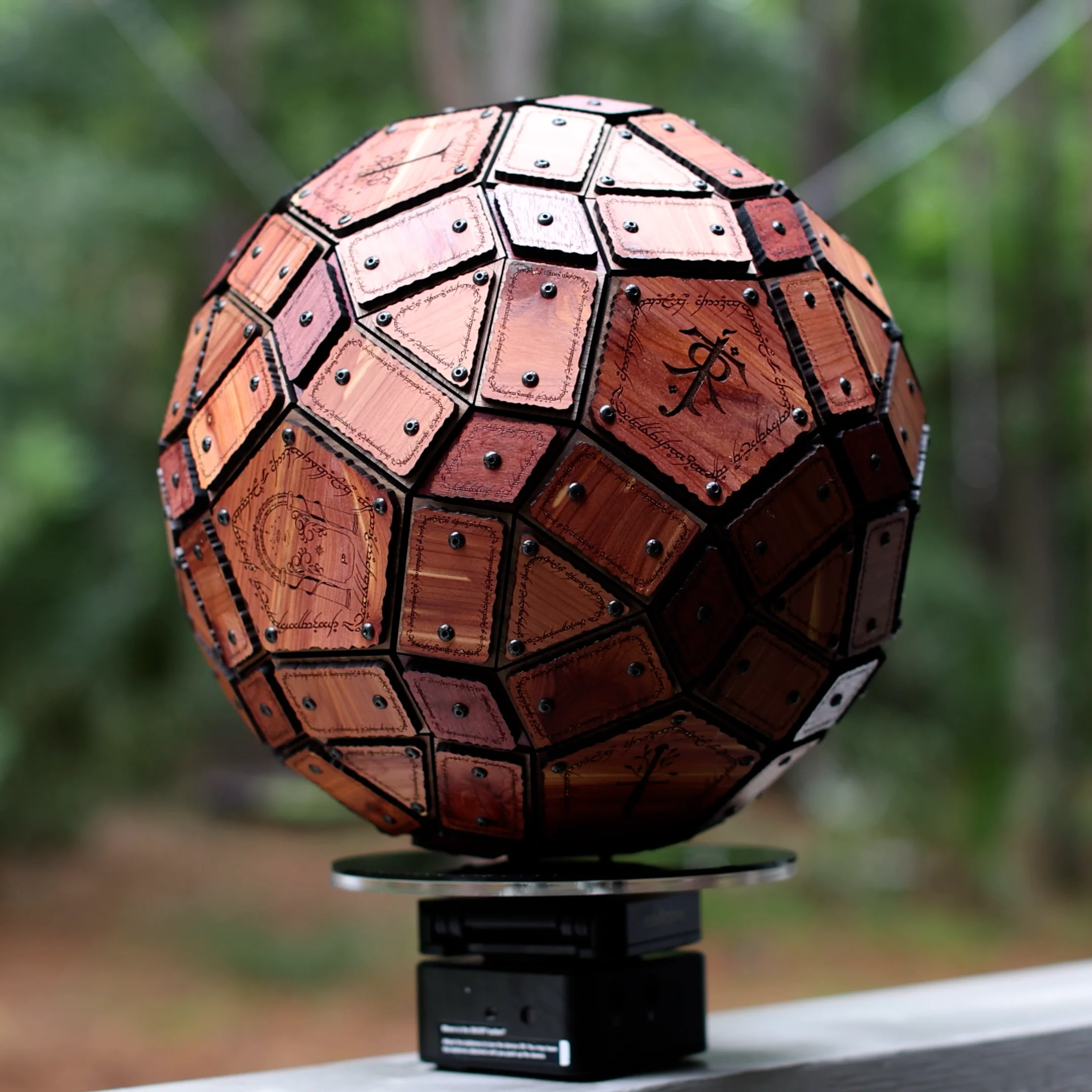 This Lord of the Rings themed polyheral is 37.1% in between a Icosidodecahedron and its dual, a Rhombic Triacontahedron. Designed in Stella 4D, this unique shape is made 2 layers of 1/4" plywood, with the bottom layer being walnut and the top layer cedar and purpleheart. There are 12 pentagons, 20 triangles, 30 diamonds, and 60 rectangles. With 2 layers, this equals 192 face pieces attached with 30 internal 3D Connectors using 270 #6-32 black button head screws. Each face is laser engraved in Elvish with “One Ring to rule them all, One Ring to find them, One Ring to bring them all and in the darkness bind them.” The pentagons also have various LOTR images engraved. The 3D printed connectors were designed in Fusion 360 and printed with an Anycubic Kobra Max 3D filament printer using black PLA.