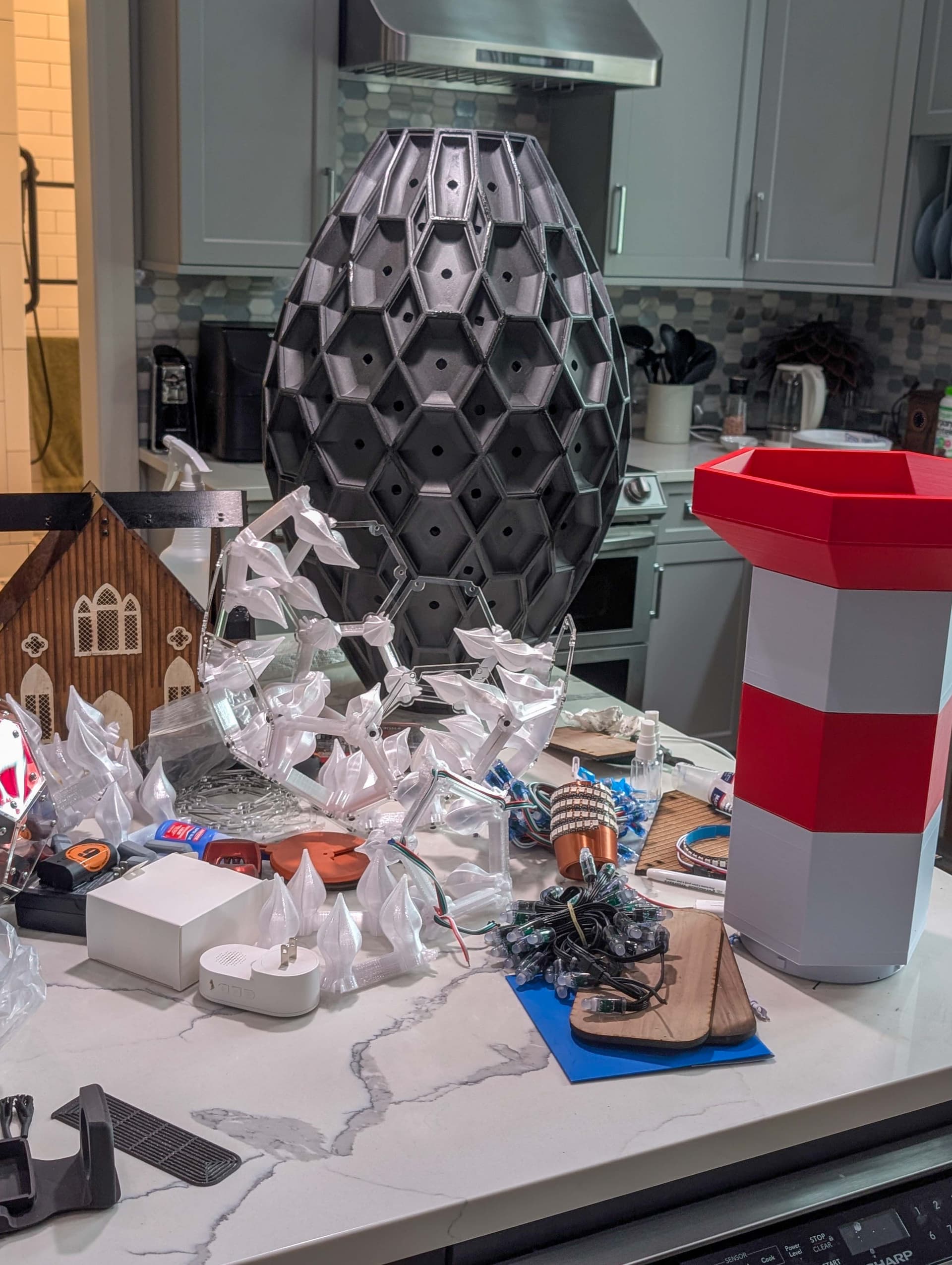 I’m guilty of having too many projects going at the same time. In my defense, being disabled, I rely on others in the assembly of almost all of my creations. I could say that my goal is to get more organized in 2026, but really just want to complete many of the “in progress” projects. Here is the state of my kitchen island at the moment. It has parts from at least 9 different projects, and thought I’d share my chaos.