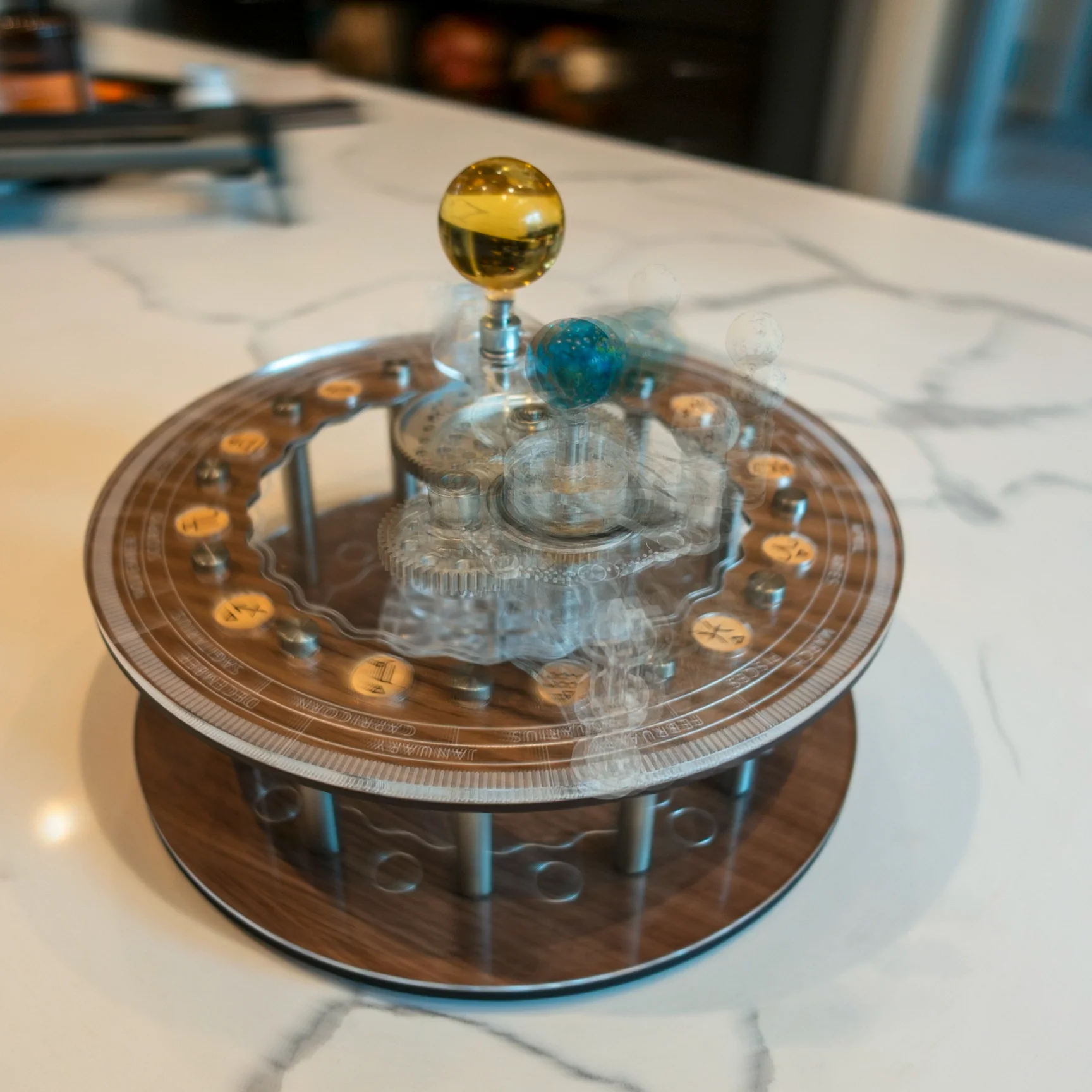 This is a complete remake of my version #2 orrery. That one, the gears got more stiff over time, and someone forced it too hard and there was some slip. I didn’t really like the base I made, so I designed a new base, and this one re-uses the marbles and one bearing from that v2 build. I used metal GoBilda gears, bearings, and D-shaft from ServoCity. The laser cut pieces are walnut, maple, and clear acrylic. The motion is much smoother, and I really like the new stand and clear acrylic gear and marble structure.