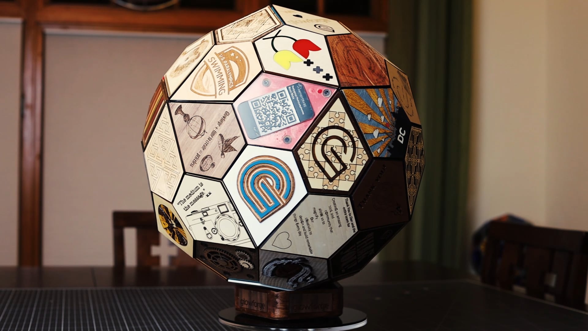 This Pentagonal Hexecontahedron has 60 tiles designed and created by 36 forum regulars. Some participants submitted one, while others made a few. The concept was to let each contributor design something that represents their style. A face tile could be a simple thank you, while others represent an homage to projects they have made with their Glowforge. The companion book showcases each tile and who made it, along with build pictures and a peek at the back of some of the tiles. We hope that you enjoy this unique piece as much as we enjoyed conspiring to make it for you. We cannot thank you enough for bringing us all together, and fueling the inspiration and magic in all of us. We look forward to discovering what is in store for Glowforge and our future together. Thank you.