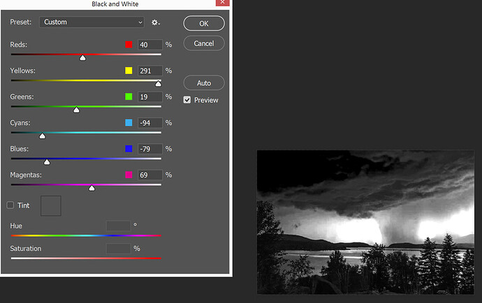 i’ve played a little. it may end up a little interesting, but it will never have the drama your aunt is expecting because the drama in the photo is the color. in black and white, especially when you work on creating more contrast, just looks like storm clouds over a lake. and the storm clouds themselves don’t look that special in B&W.