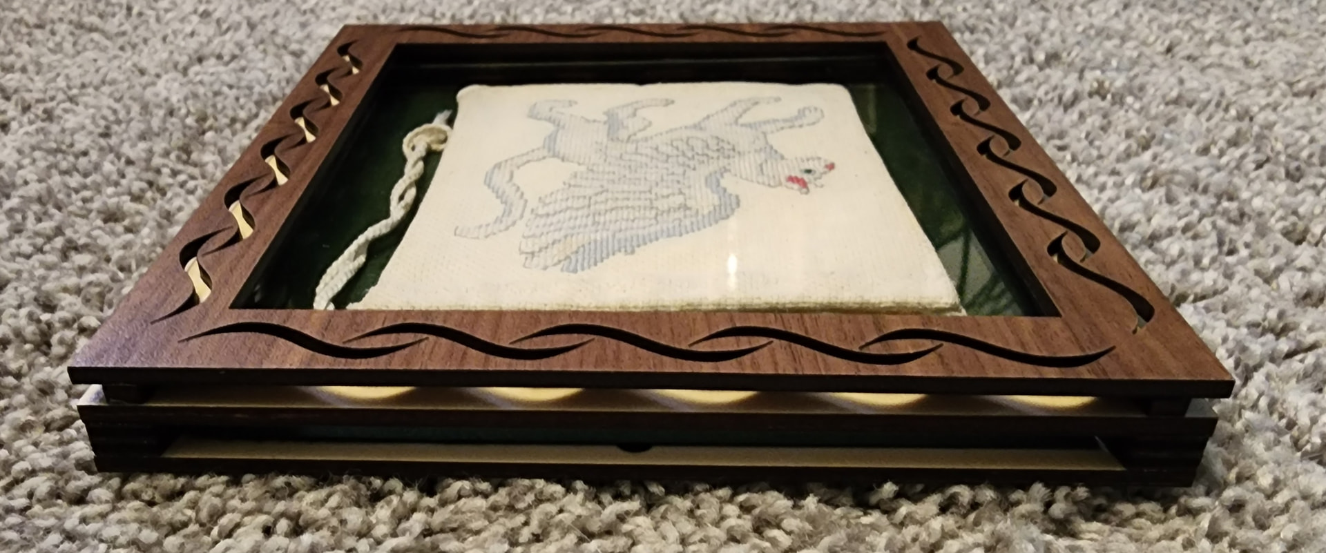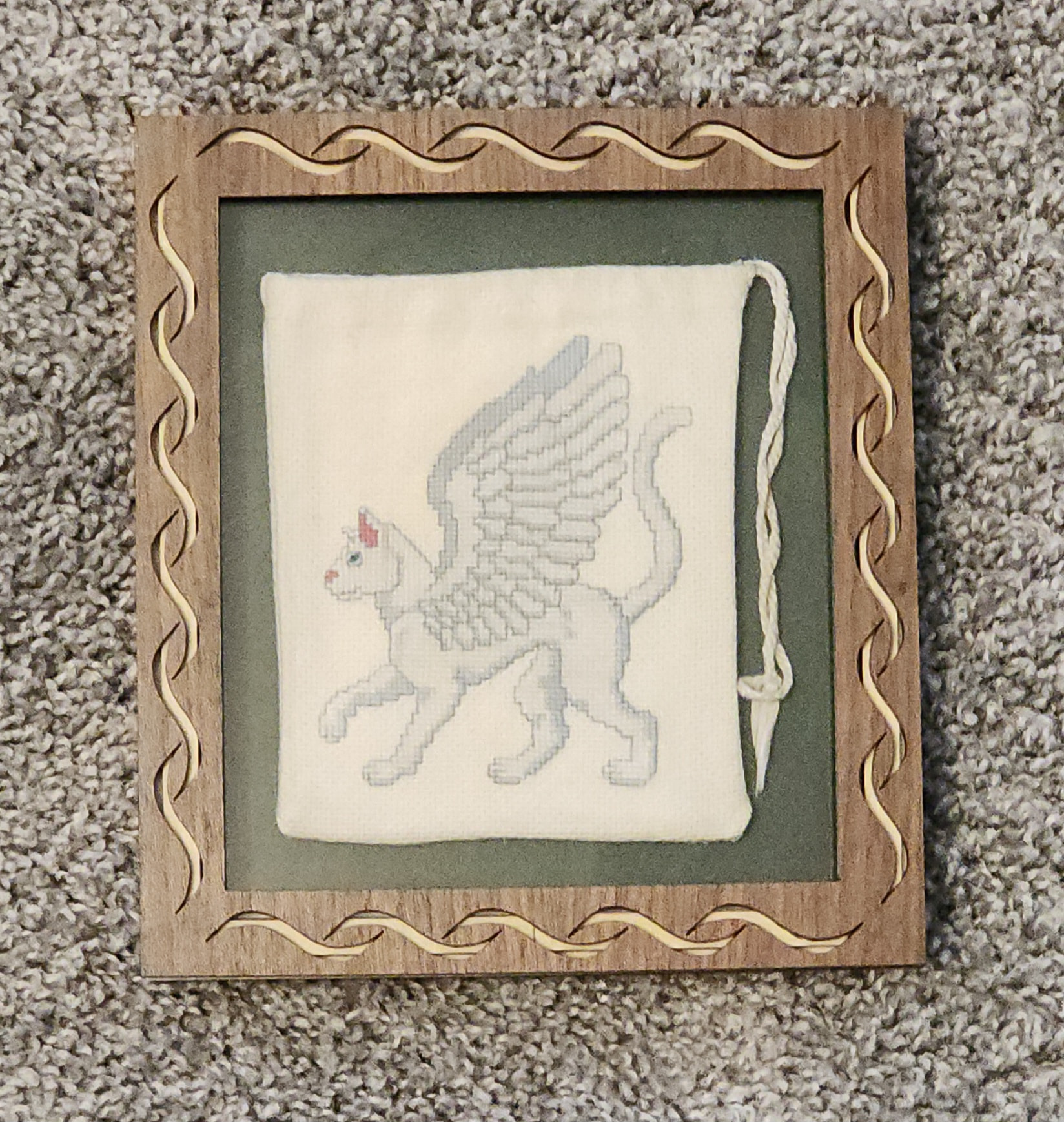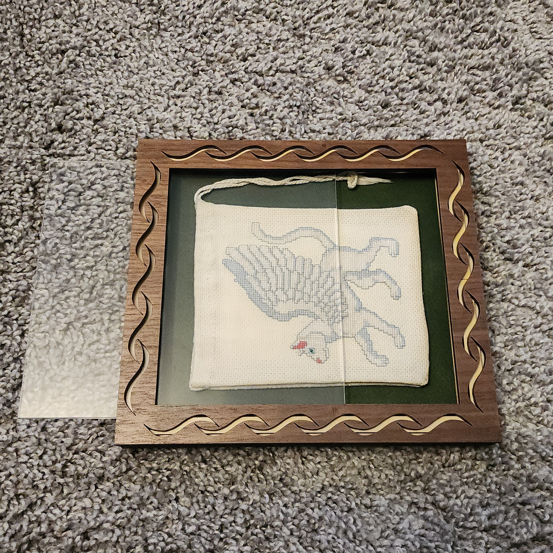 My sibling moved into a new house recently and we’ve been going through boxes of stuff. We ran across the beautiful embroidered bag that had been a gift, and used for years, many years past. Thinking it would end up back in a drawer so I offered to make a frame.