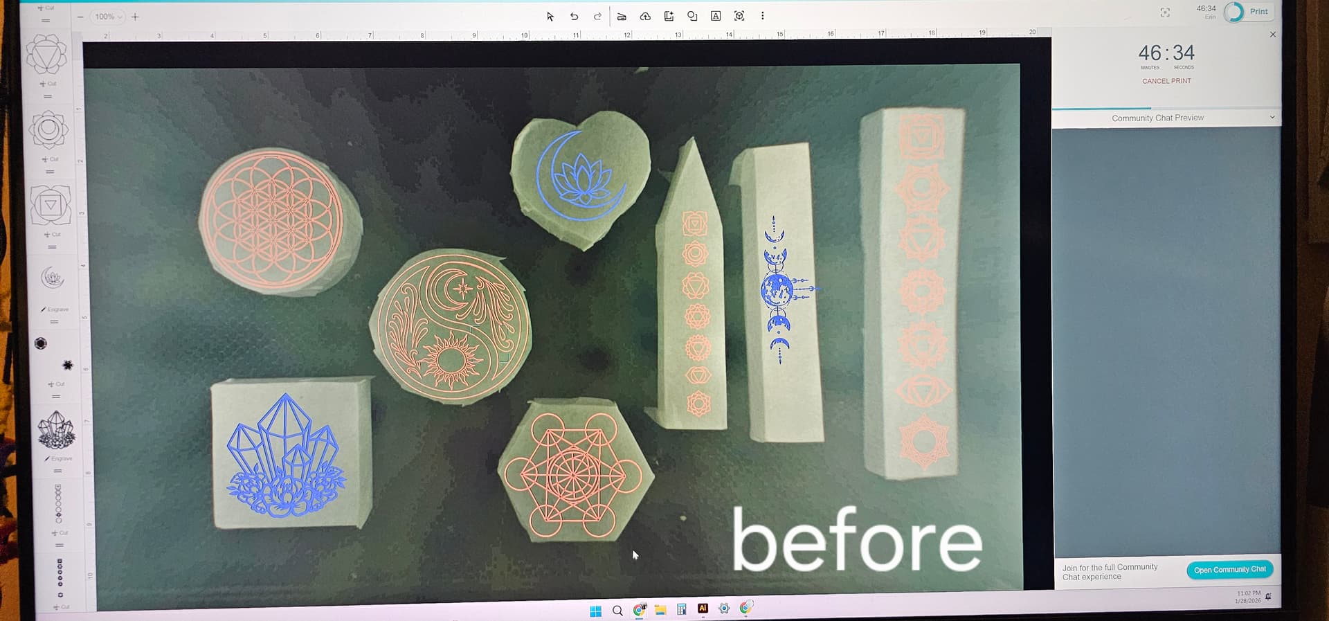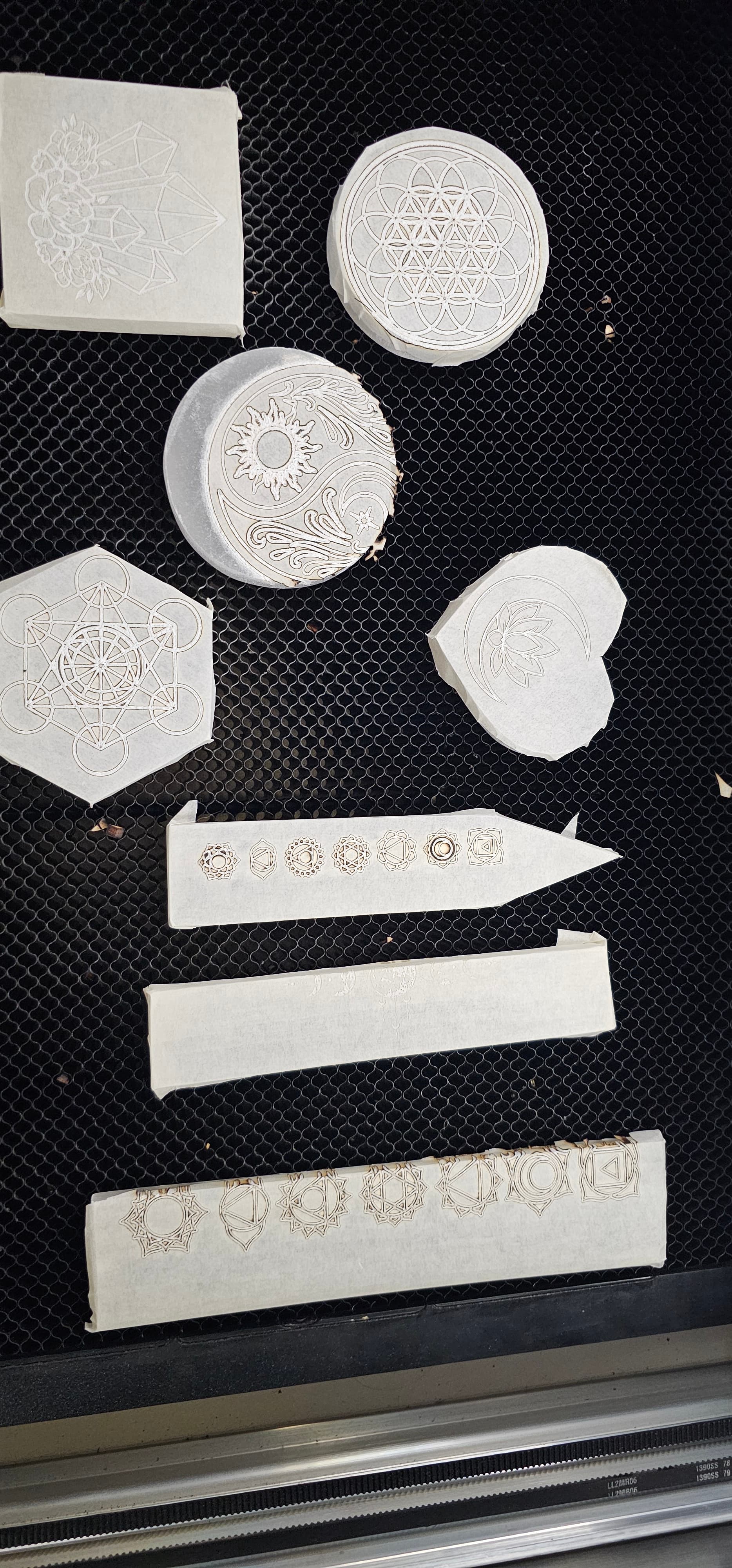 Although the material is 3/8”, it appears to be masked and in some cases the masking is folded underneath. This changes the height of the individual items and can affect the focus. If you focus on each individual item before placing your design on that item you will have better luck. However, you will not get precise alignment as the lid camera is not a precise tool. It is most accurate in the center of the bed.