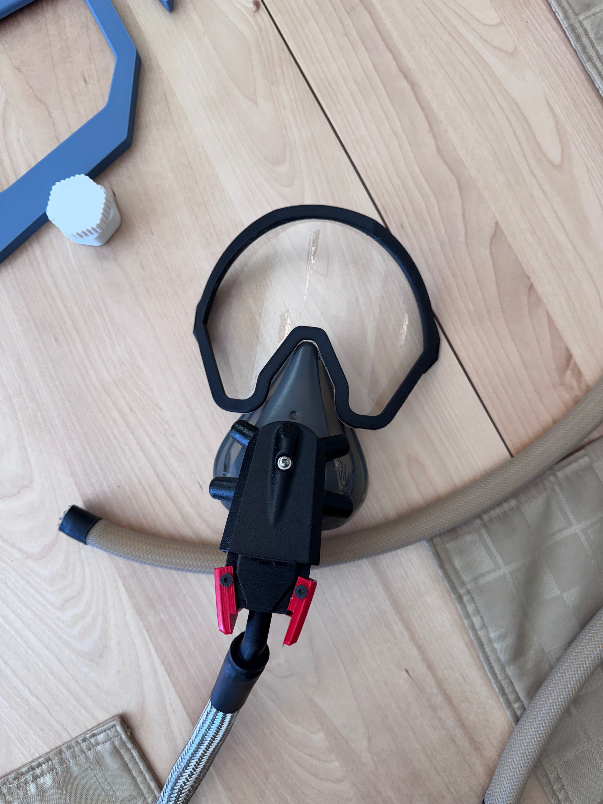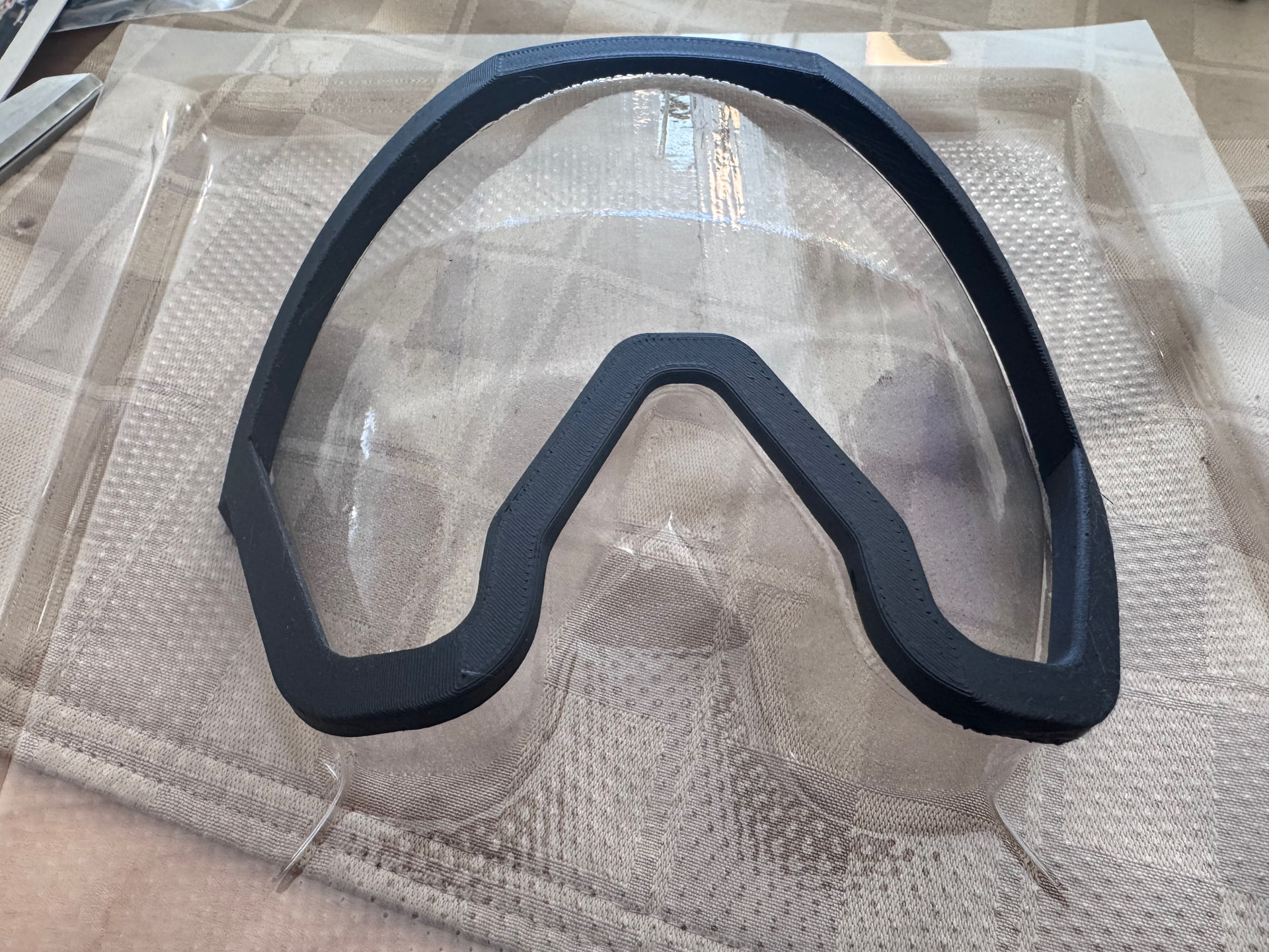Today’s project was finishing the captain’s emergency oxygen mask (cosmetic but not functional in any way). The oxygen masks on the Airbus, Embraer and Boeing aircraft is made by Eros. On Ebay even a janky used one is almost $700 and a new condition one is $3500. These masks are extremely complex and as a doctor I would call them a BiPAP mask since they are positive pressure since at 41000’ the low pressure means even 100% oxygen is insufficient, so the mask includes a high pressure regulator, similar to what is in a SCUBA/SCBA unit. The model in the Airbus has an integrated smoke goggle set, and today’s project was making the smoke goggle. I 3D printed a buck the shape of the lens with a small inset around the edge for mounting.