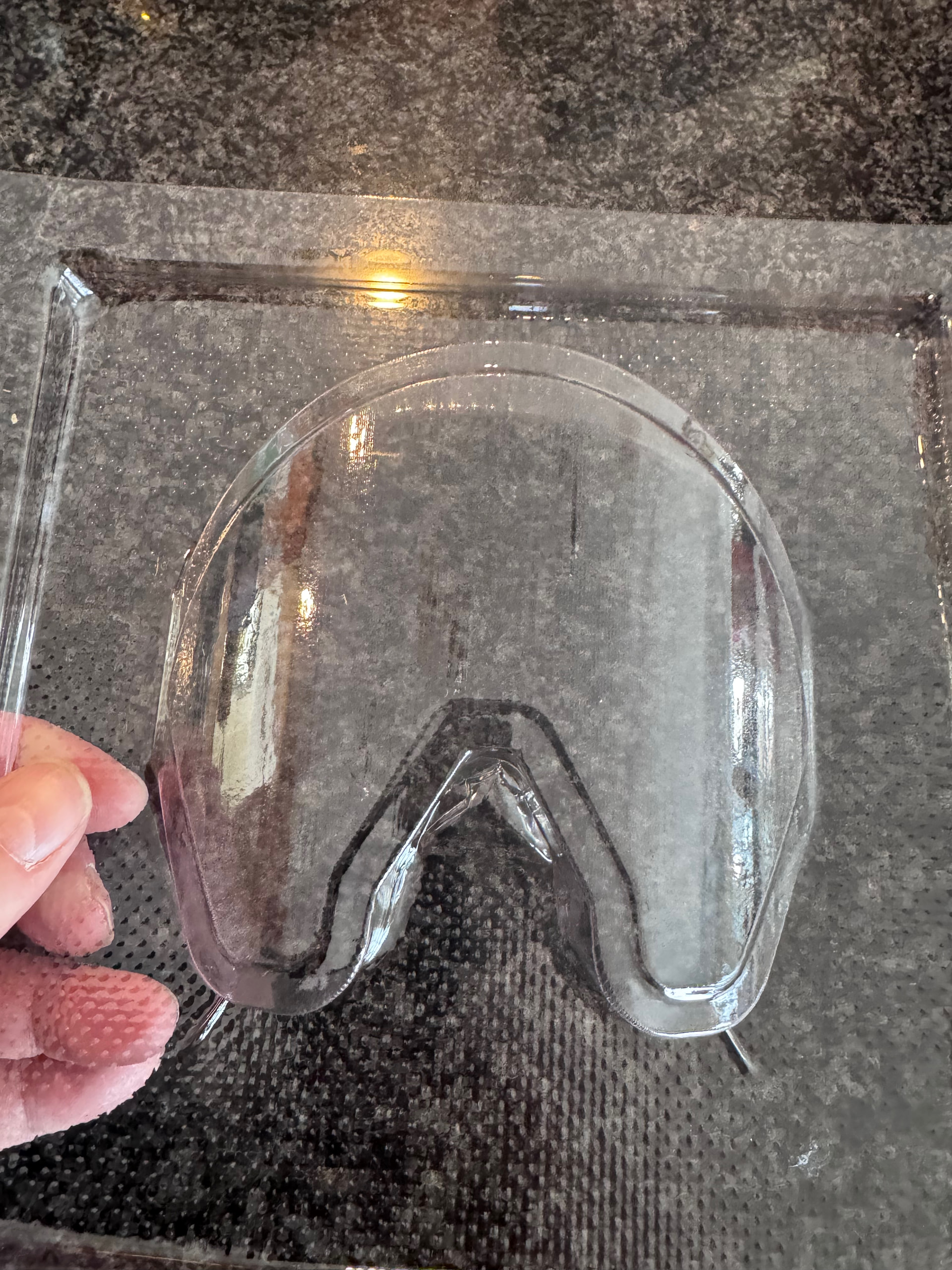 Here is the 0.5mm PETG sheet in the vacuformer over the buck (That is putty smoothing out the layer lines).