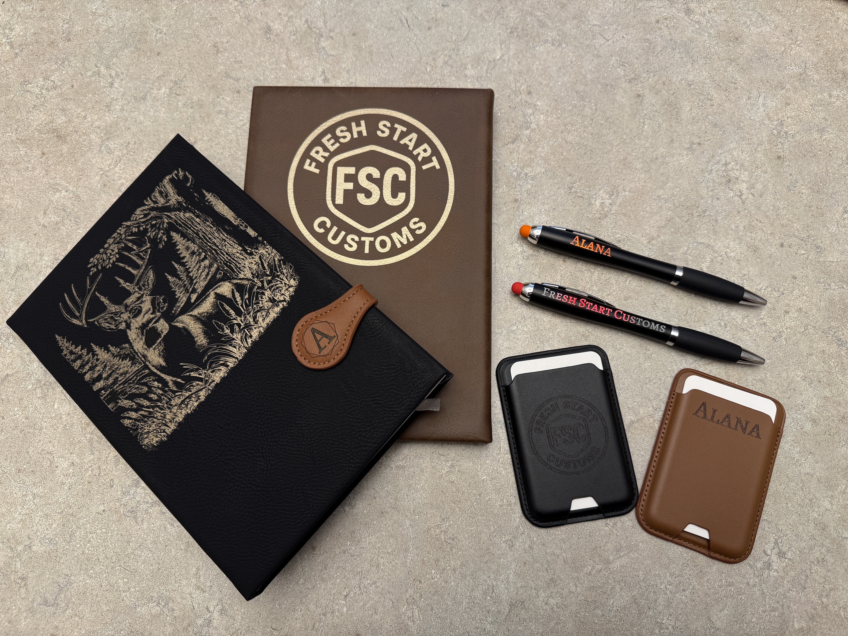 So I wanted to start a thread on random unique laser materials/ items. Here are some laser engravable items that I got. They are sold from xTool but you can get some from Amazon and other places as well. If you have other unique items that you thought were cool please share them and what they look like. The pens are cool but got to make sure they are shorter phrases as the light fades on the edges of long words.