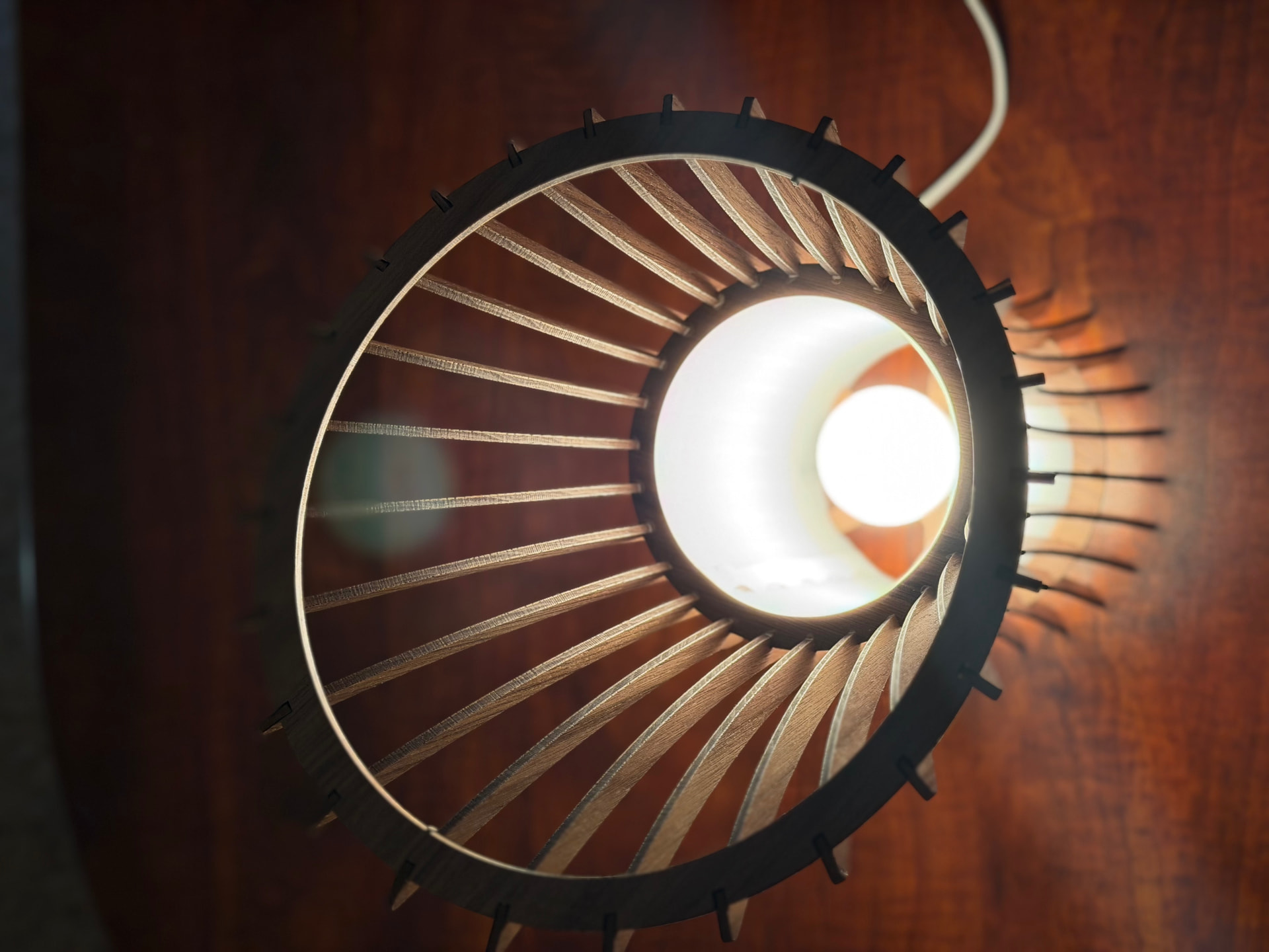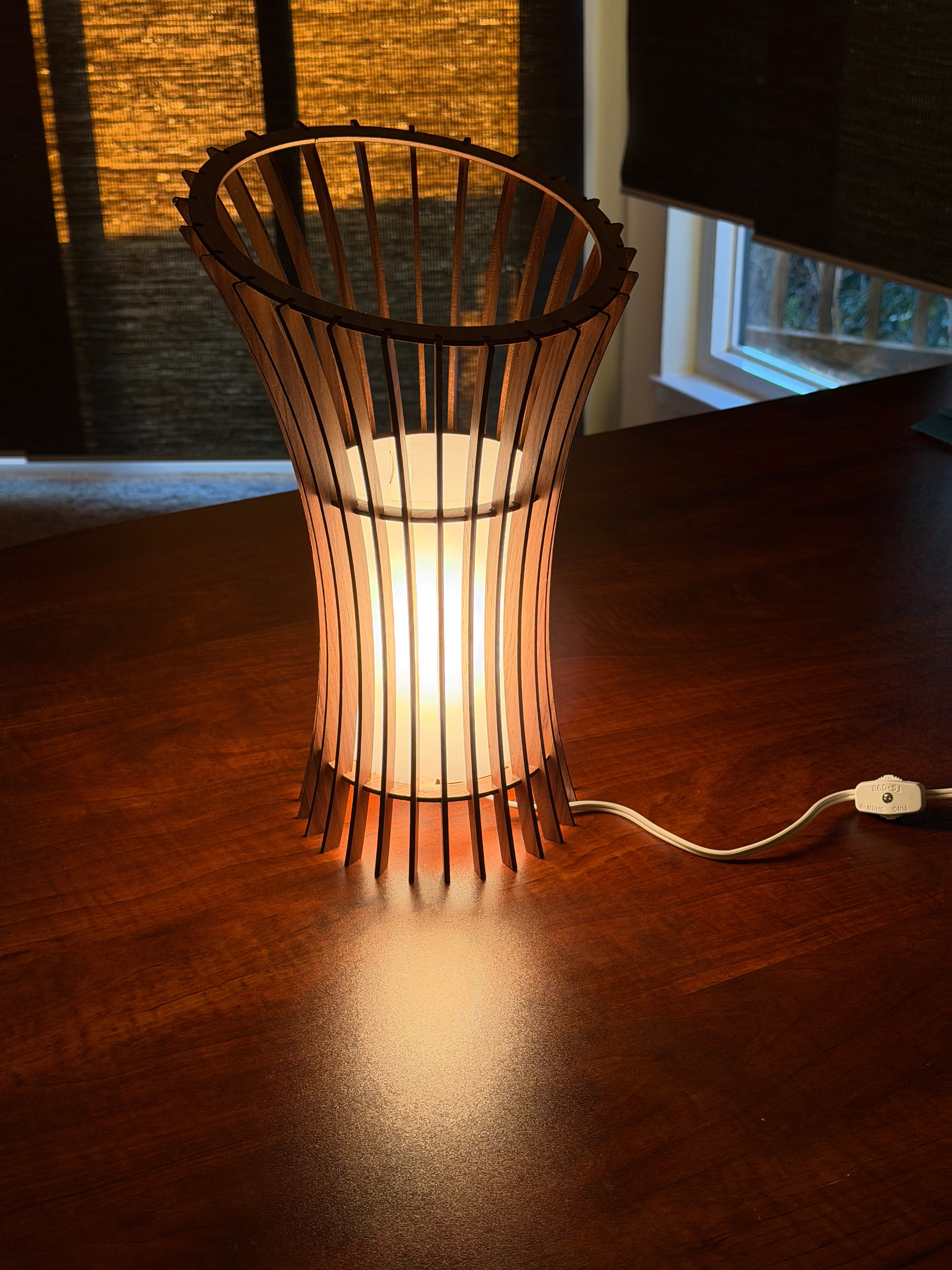This project was inspired by the work of Tim_ung ( Wood Spiral Table Lamp ) and ( Angular Wood Shell Lamp – Glowforge Shop ). I added a diffuser to the bulb, and a 30 degree cut across the top. I used a very simple candela bulb socket available from Amazon. To protect the top prongs I experimented with a frosted plex disk, and a simple ring. The disc would need to be removed to change the bulb, so it can’t be glued in, but stays there nicely. I would like to know which design folks like better! Wood is Glowforge walnut ply. The diffuser is Vellum, but rice paper would look very nice as well. It is designed as a nightstand light.