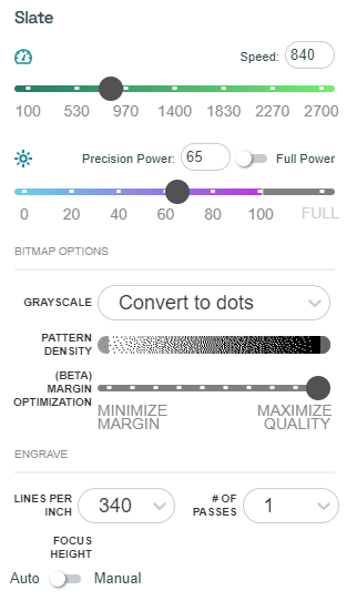 I use these settings to engrave slate. I prepare the slate with shellac to make the black more pronounce and in most cases, I invert the image