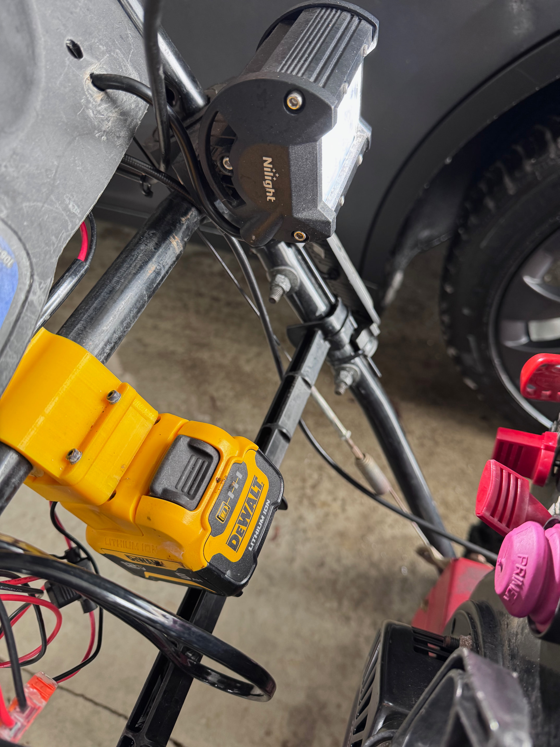 When I bought my Toro snowblower 19 years ago, I never really worried about how terrible the “headlight” (read small glow thing on the handlebar) was, I also hadn’t realized snowblowers (and other small engines) don’t have a real electrical system, and I quickly learned that light provided almost zero illumination for nighttime ops. So I went and bought a pair of 32W LED ATV Off-Road driving lights and mounted them, I’d tried using a motorcycle battery in a 3D printed battery box, but that solved the illumination issue, but ugh lead acid batteries are terrible. So this year I found a 3D printed adapter to use Dewalt Max batteries, and man do they light up the scene. And when one runs out you chuck another from the charger in. My 5Ah battery will give me about 2-2.5Hr (in the cold), and like most folks who do a lot of making I have multiple batteries of my chosen tool brand. It also powers a LED orange strobe since I often am out in the street while town plow ops are ongoing (that is the thing on the post on the right side of the blower that is covered by snow in front of the chute (it is still blinding even covered in snow). The switch is an illuminated waterproof switch (red glow bottom right) on the deck.