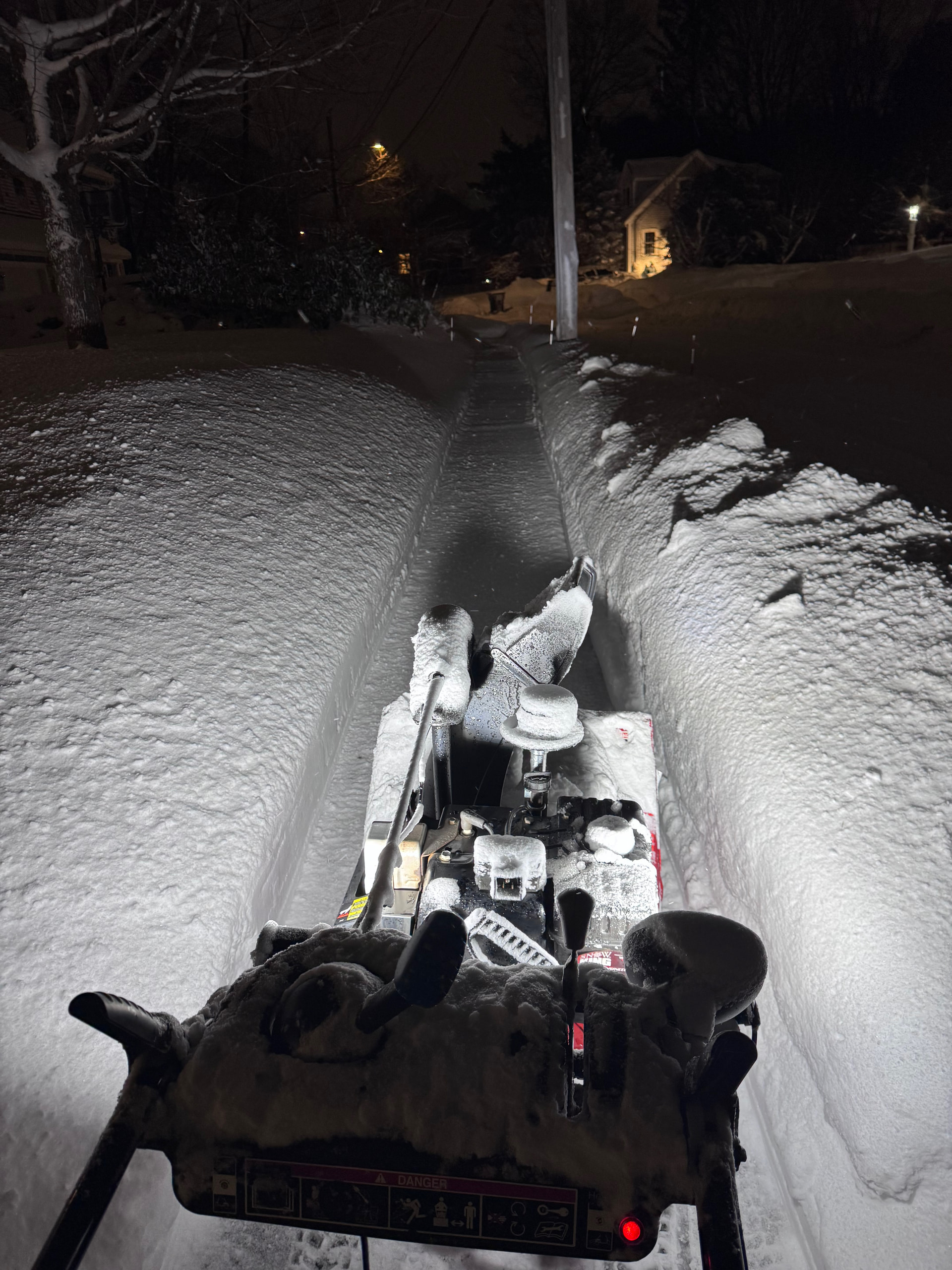 Something I have never seen. However this year I have made the decision to switch from gas to the big Ego 28” electric, it’s expensive (but so is annual maintenance on the Toro which after annual service (that things goes through belts like crazy) the maintenance pays for the Ego in 4 years! Plus I am sick of gas spilling and one thing I really want are the heated handles. The Ego has 4 LED headlights. The purpose of the headlights (other than seeing better at night) is to be seen REALLY well by the plows. Those guys drive like it’s Death Race 2000 on our street and so easy to get run over (The town for some reason never pushed the bank back to the width of the street so if I don’t move the banks back a couple feet 2 cars can’t pass each other (what is super annoying is they narrowed the street by 5’ to make it “2 plows wide” but the plows drive down the middle (grrr). plus I need to blow the storm drains or we get huge puddles/ice in the street. All of that puts you at risk of being run over so the lights really help to be seen from hundreds of yards away. Since I live right on a bend in the street you often don’t get much warning. When the town uses the big highway plows you hear those and see them from far away, but when it’s a contractor in a F-250 there is little warning.