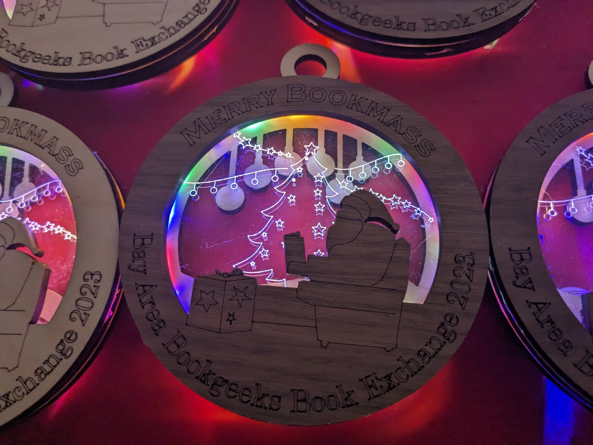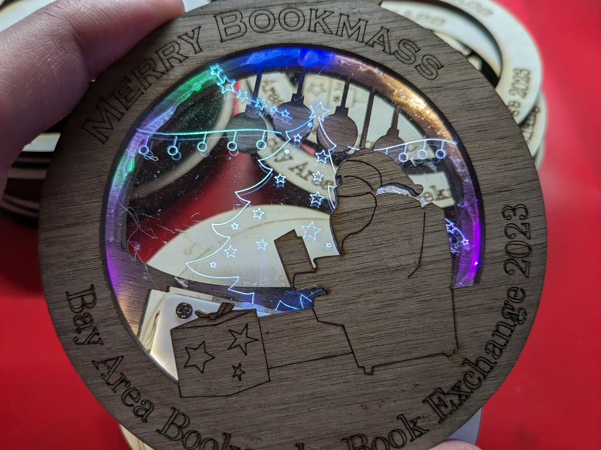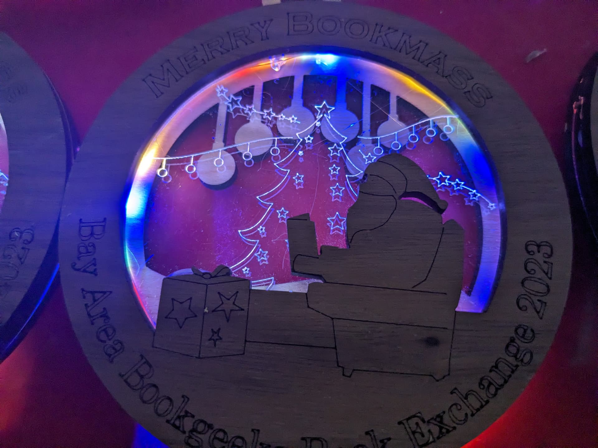 After a bit of designing I came up with something that had a few layers of plywood with a piece of acrylic with a pattern scored into it that gets edge lit by some cheap led strings