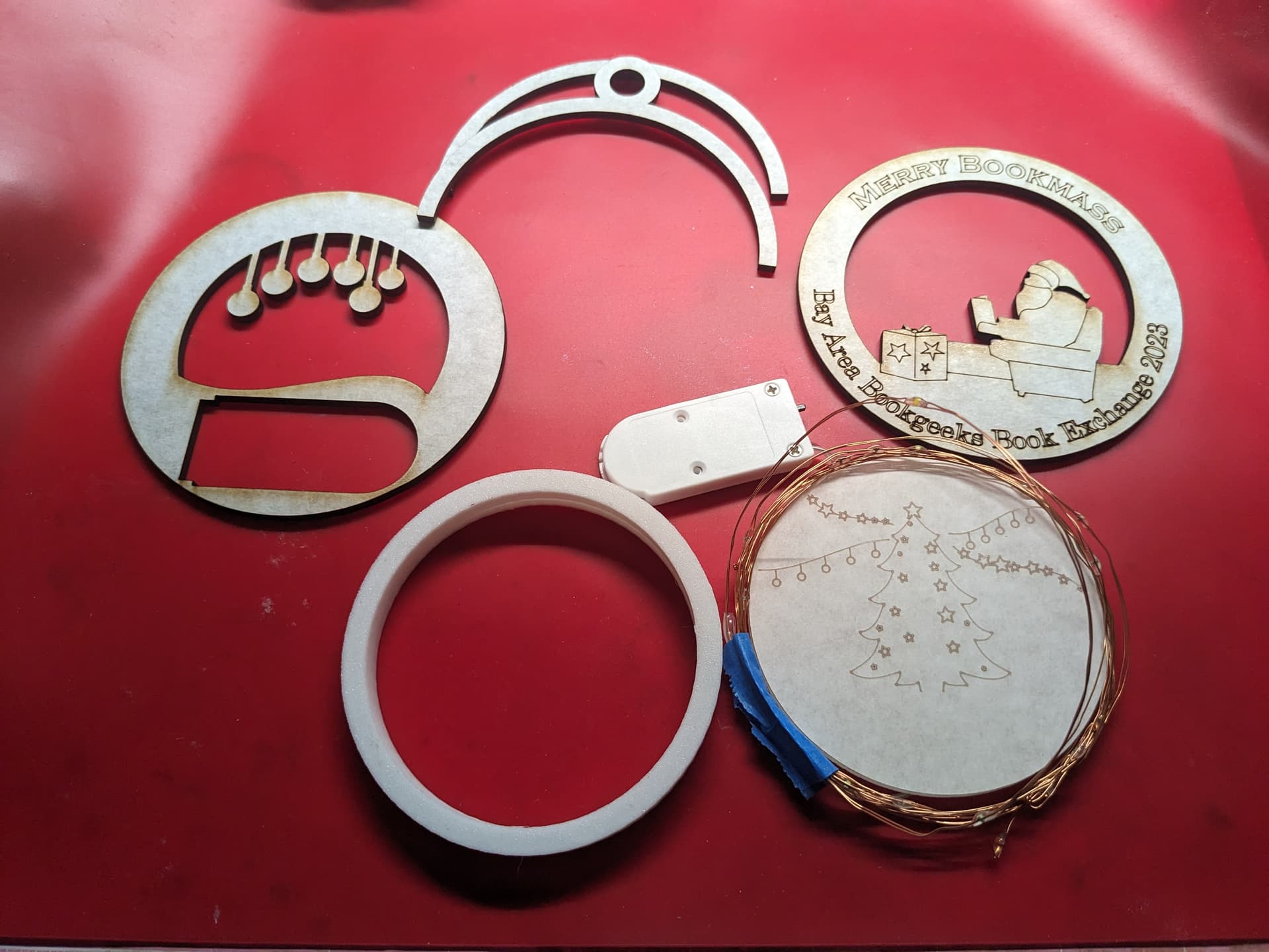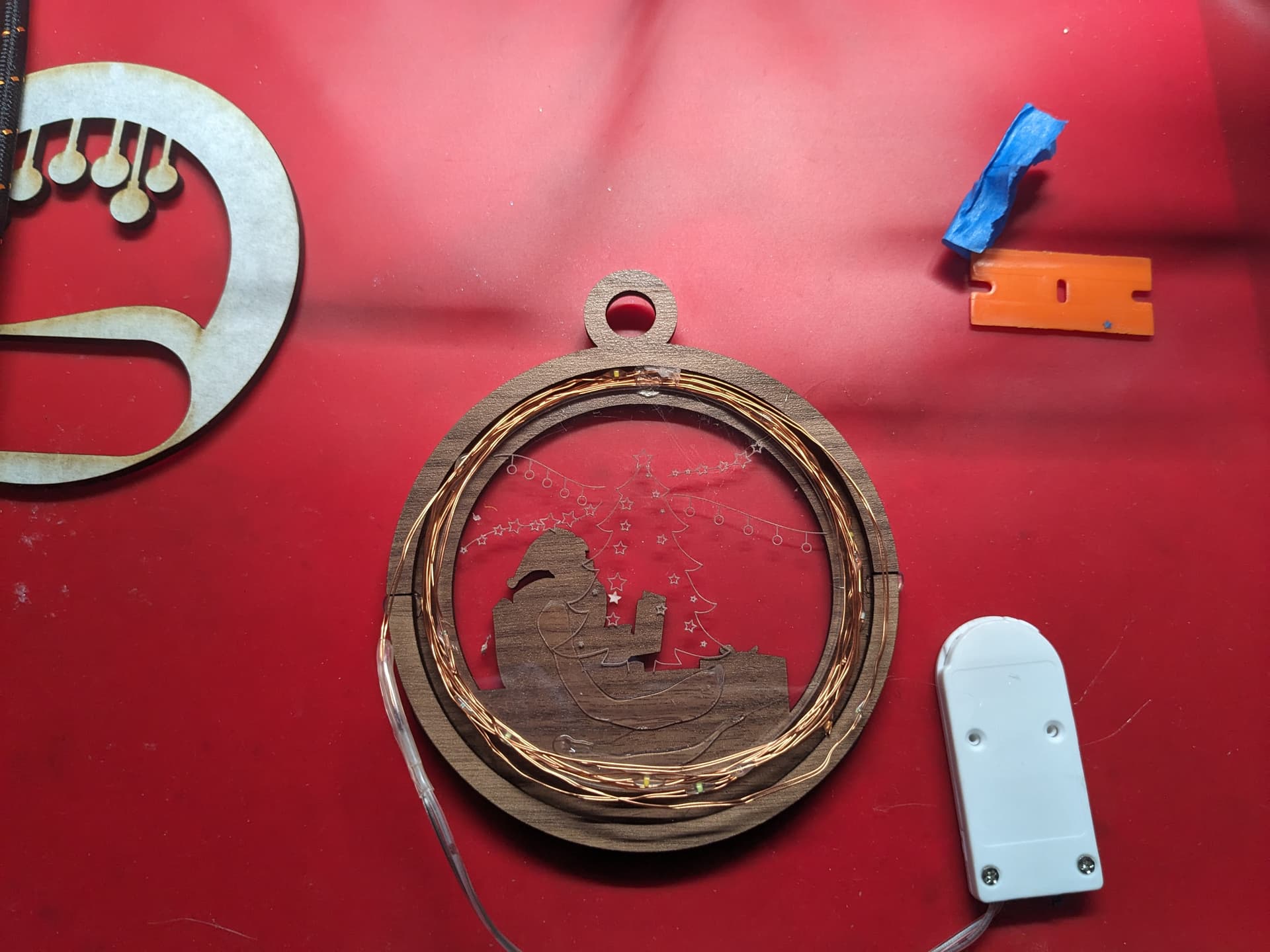 The design is three layers a front and back in plywood and then a middle sandwich with a ring of wood on the outside and then a piece of acrylic in the middle. The ring and the wood in the middle layer have a gap where the led’s can go and then there is a cut out on the back for the battery pack.