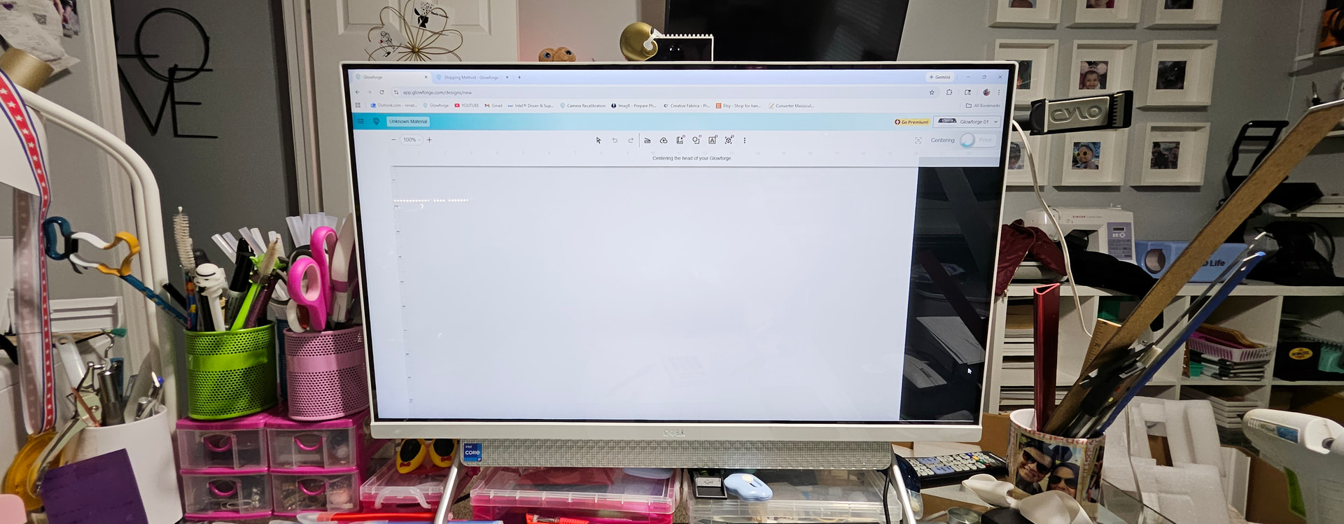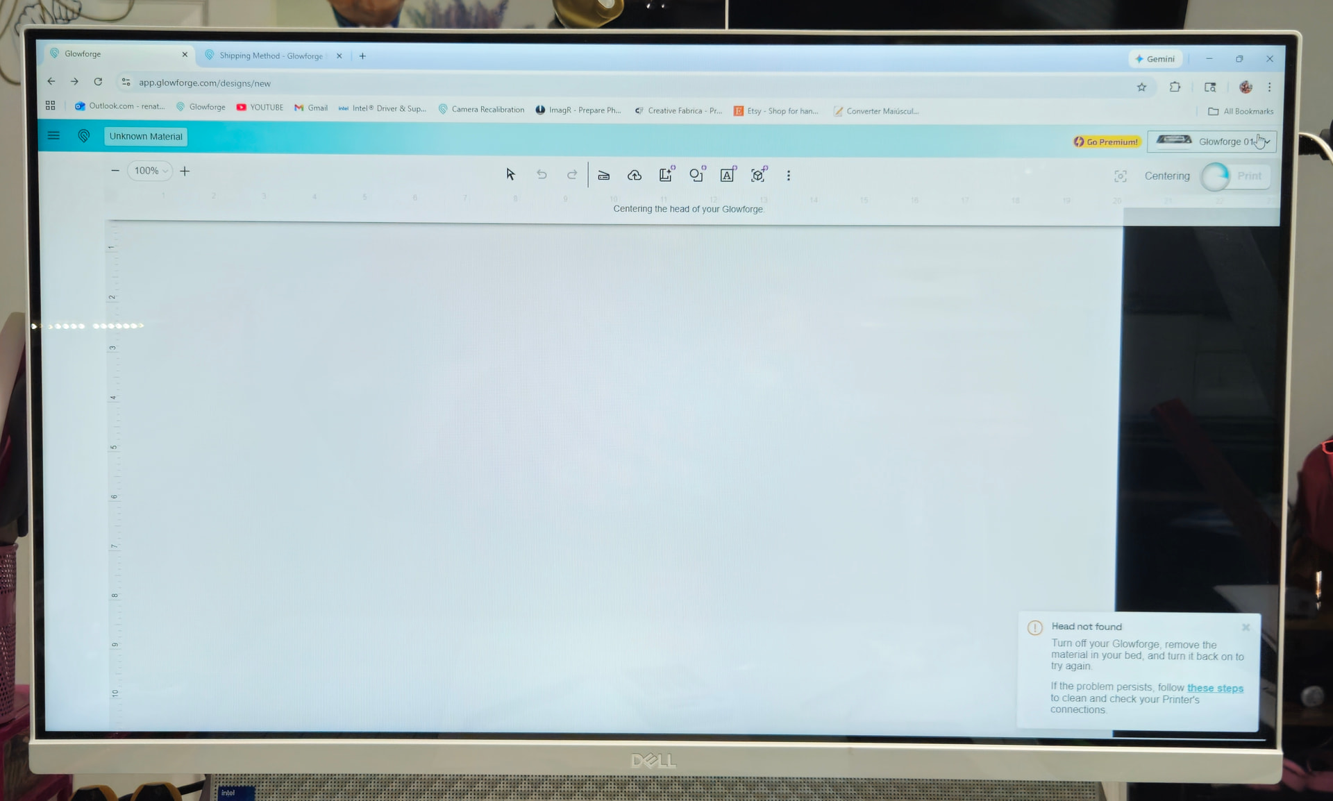 The Glowforge does not show the work screen and does not find the print head. All the cables seem to be properly connected. When I turn on the Glowforge, the printhead doesn’t move at all. I only hear some clicking noises, and the screen displays a message that the machine is focusing. However, nothing else happens, and soon the message appears that the printhead was not found.